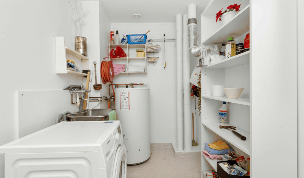 Because dryers make so much lint, laundry rooms are unexpectedly dusty. Experts say that even with a good lint trap, microfibers will always get into the air and rest on exposed utility shelves. Professional organizers say that these fibers typically react with the chemicals in detergents, leaving a coating on your “clean” linens and storage containers that feels gritty to the touch.