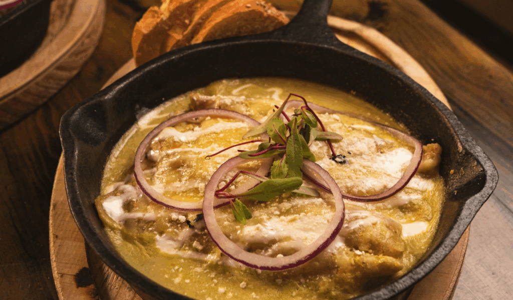 By caramelizing onions more quickly, this version speeds up the classic. Add the beef broth, thyme, and a little vinegar after the thinly sliced onions have been browned over low heat with a little sugar. Under the broiler, serve with melted cheese and toasted bread on top. Without spending hours on the stove, the end product is savory, rich, and incredibly satisfying. For optimal results, use high-quality broth, and don’t omit the cheesy toast-it’s a must.
