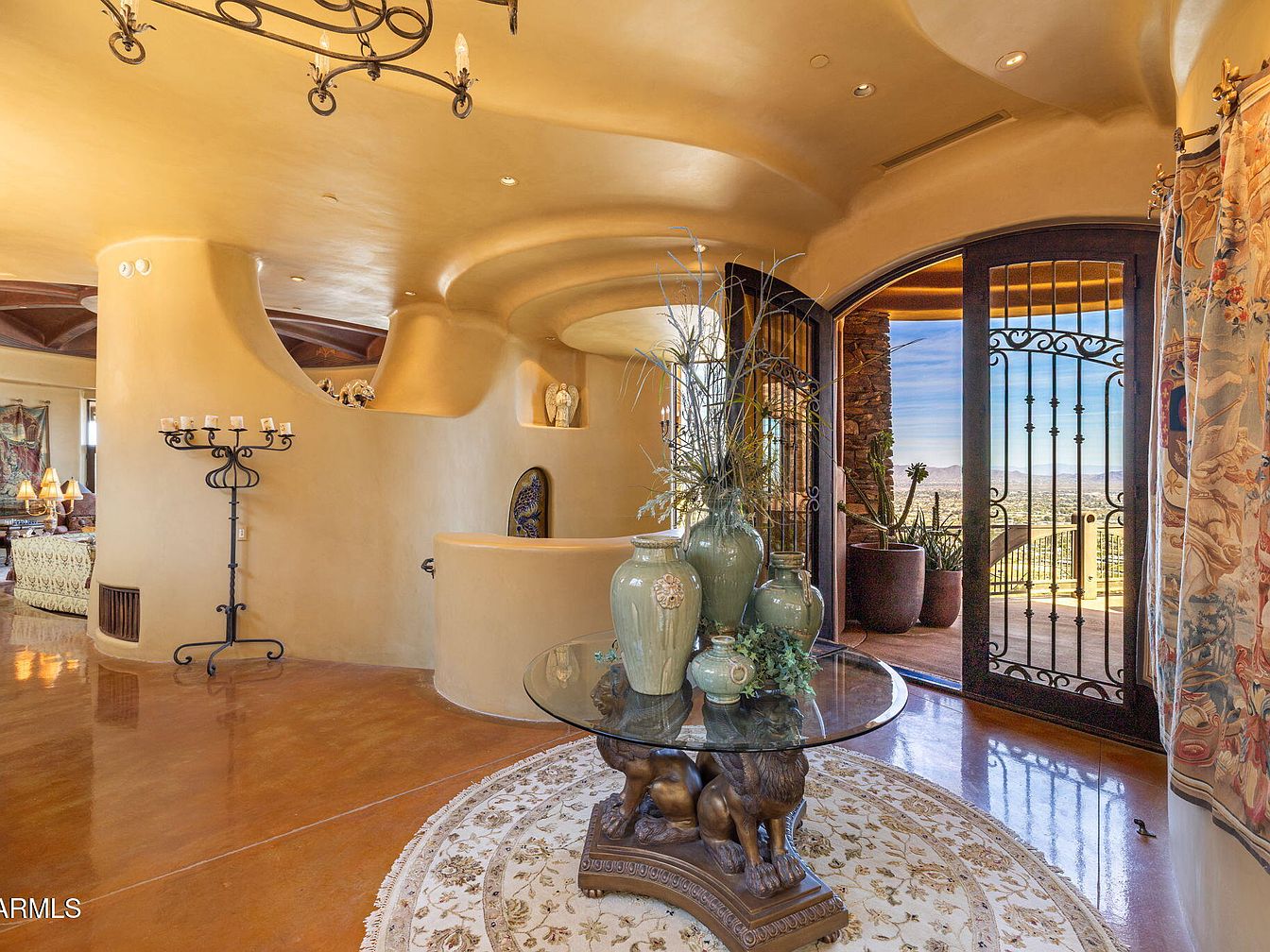 The entryway features a warm color palette with soft beige walls and polished, reddish-brown flooring. Curved architectural elements are prominent, including a graceful wall that flows into the ceiling. A decorative chandelier hangs above, providing ambient lighting. A round table with lion-shaped legs hosts an arrangement of elegant green vases, complemented by subtle greenery. The space is framed by an ornate arched door leading to a stunning vista outside. Richly patterned drapes soften the entry, while a prominent iron gate hints at security and grandeur. Decorative niches in the wall add character and charm.