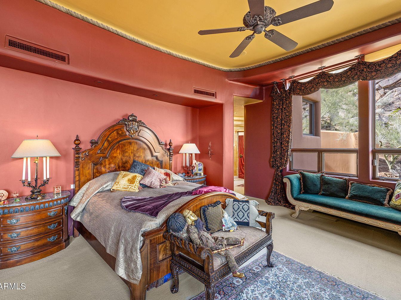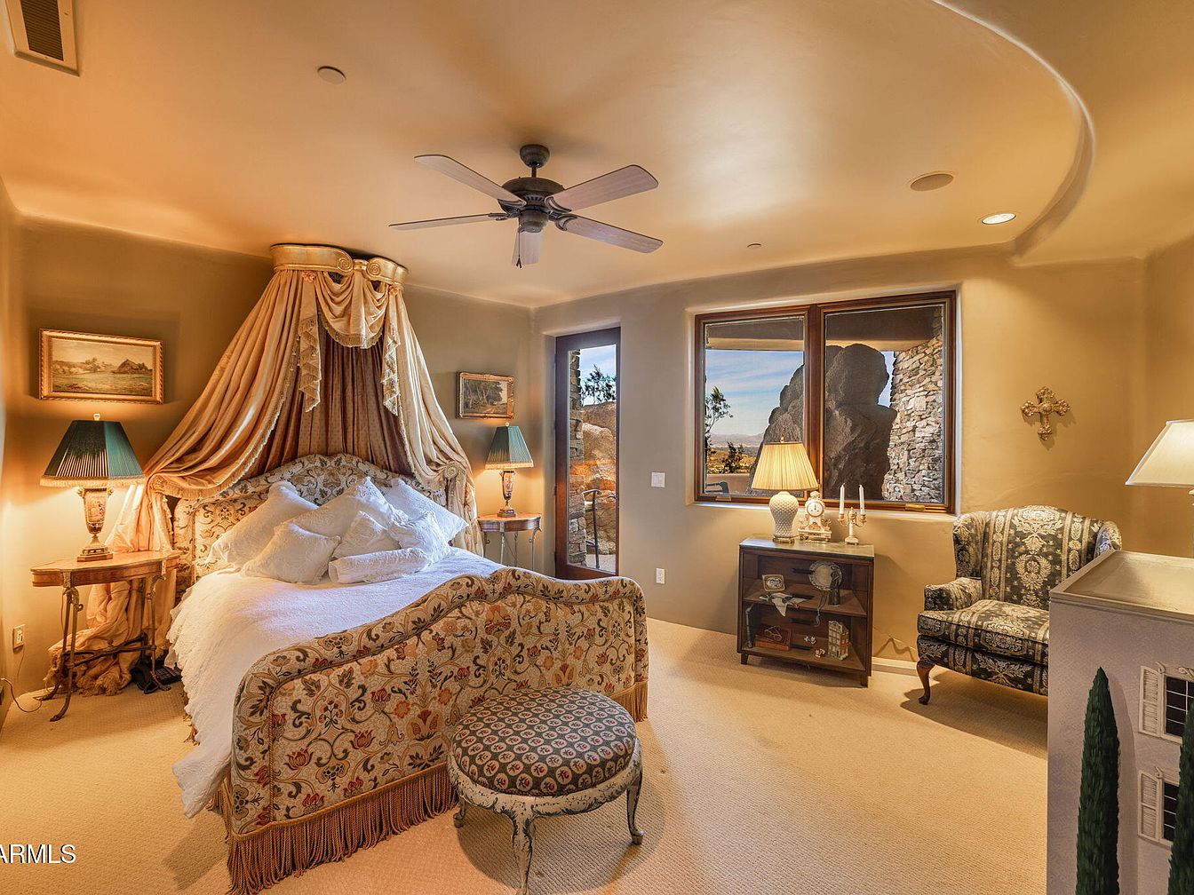 The bedroom exudes a lavish aesthetic with a rich, textured color palette dominated by warm earthy tones. A grand bed features an ornate, upholstered headboard topped with luxurious drapery, creating a focal point. Flanking the bed are elegant bedside tables adorned with stylish lamps, casting a warm glow. An antique chair features intricate floral upholstery, adding to the room’s vintage charm. Large windows showcase stunning rock formations outside, inviting natural light while providing beautiful views. Soft carpeting underfoot blends with the overall cozy ambiance. Architectural details like curved ceiling edges add sophistication to this intimate retreat.