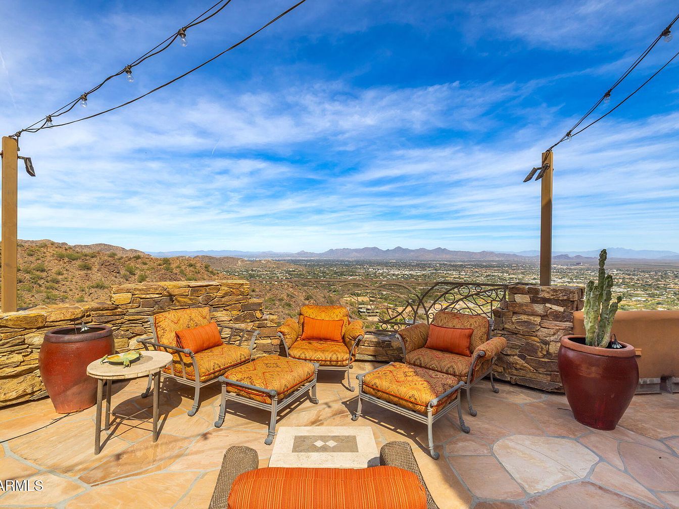 This outdoor patio showcases a stunning view framed by rugged mountains. Terracotta tiles create a warm ground surface, complementing the earthy tones present in the stone wall bordering the space. Comfortable lounge chairs with plush orange and patterned cushions encourage relaxation, while a small circular table of natural stone provides a practical surface for drinks or snacks. Ornamental wrought iron railings add a touch of elegance and define the space, hinting at a seamless blend of rustic charm and modern comfort. Strands of outdoor lighting overhead promise ambiance for evening gatherings, enhancing the inviting atmosphere.