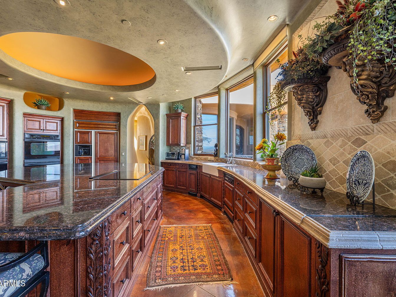 A spacious kitchen features a curved layout with rich wooden cabinetry and a dark granite countertop that contrasts nicely against light-toned walls. The ceiling is uniquely designed with an oval recess highlighting a warm, golden hue. Large windows provide abundant natural light, illuminated further by recessed lighting. Decorative stone accents and two ornate wall brackets house lush greenery, enhancing the organic feel. An intricately patterned area rug adds warmth to the polished flooring. The combination of natural materials and elegant finishes creates an inviting and sophisticated atmosphere, perfect for culinary creativity and social gatherings.