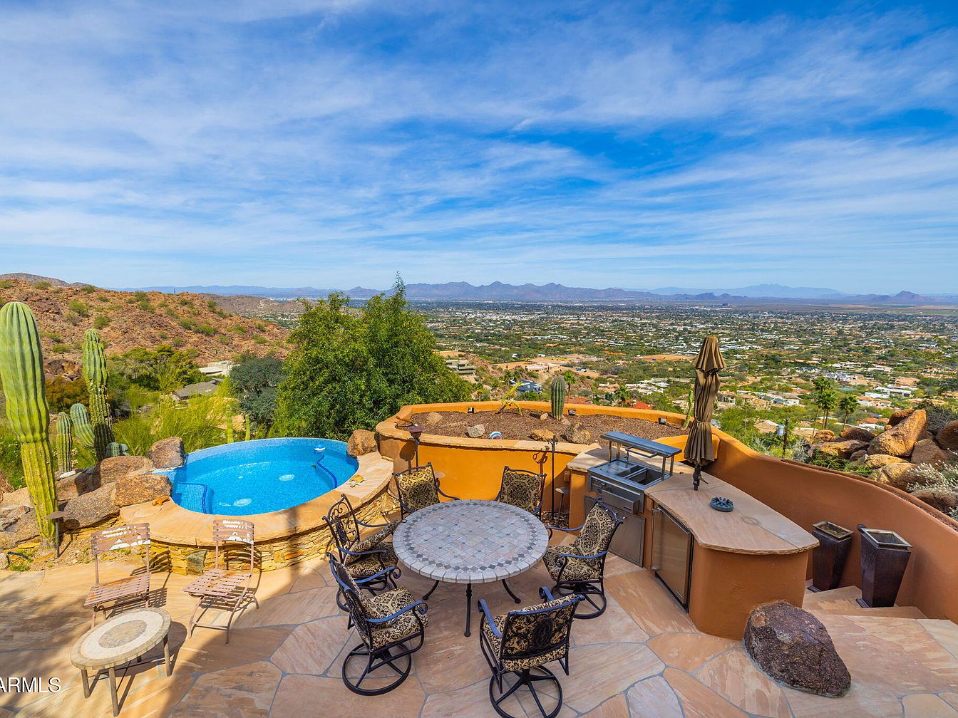 This outdoor space features a stunning view of the surrounding landscape and city below. A circular hot tub is built into natural stone accents, adjacent to a stone patio where a round dining table is surrounded by intricately designed wrought iron chairs. Sun loungers are placed nearby for relaxation. The color palette is warm, with earthy tones that blend seamlessly with the natural environment, accented by vibrant cacti. An outdoor grill area enhances the functionality of this space. Large boulders and desert vegetation contribute to the rugged beauty, making it a perfect place for entertaining or unwinding.