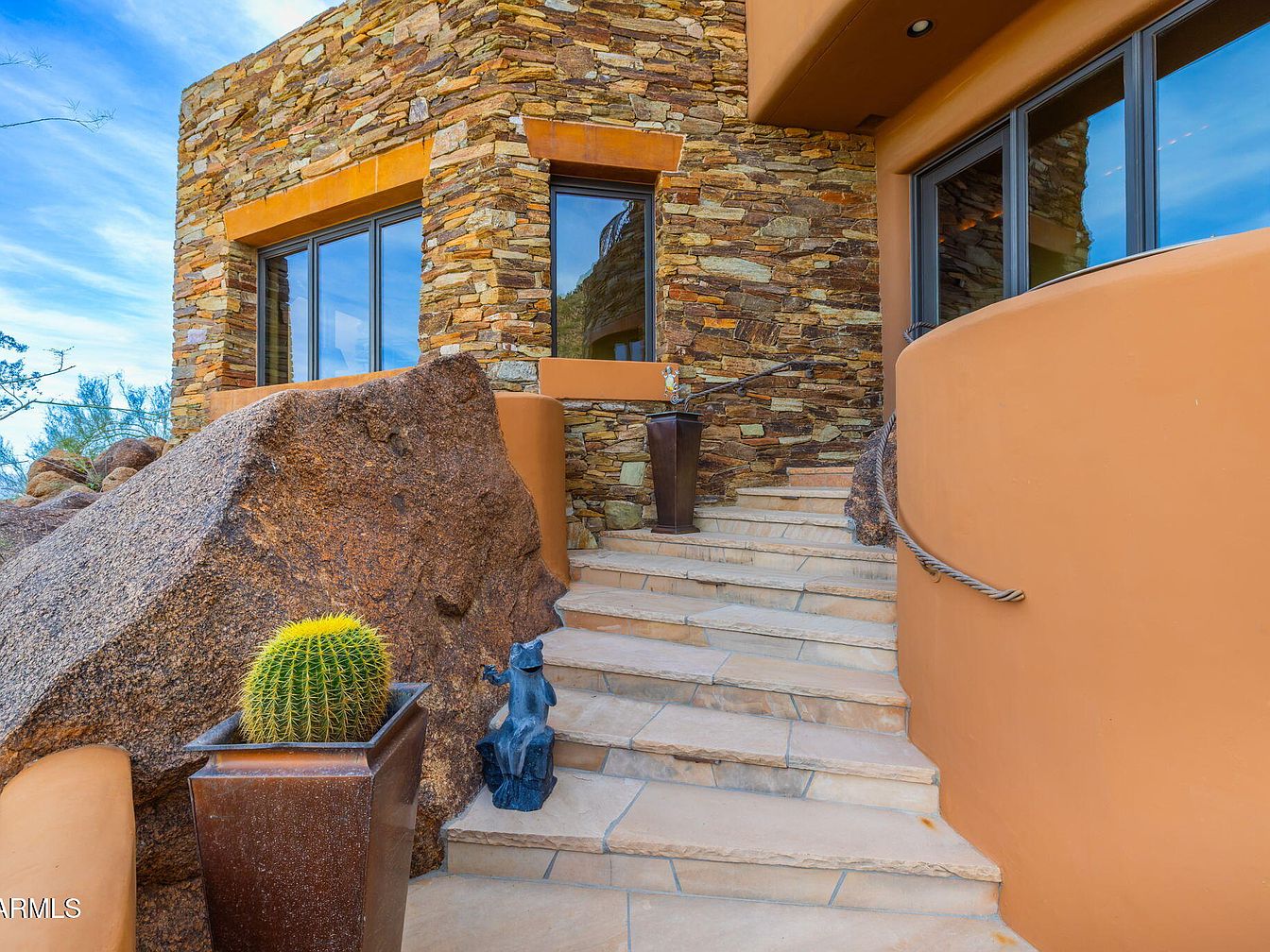 This entryway features a stunning stone facade complemented by earthy tones. A broad, curved staircase leads up to the main entrance, bordered by natural boulders that blend seamlessly into the landscape. Rich rust-colored walls contrast with the textured stone, enhancing the organic feel. Potted plants add greenery, including a vibrant yellow cactus that softens the stone’s ruggedness. A sleek, dark sculpture stands beside a rectangular planter, adding an artistic touch. Large windows reflect the sky, providing natural light while offering expansive views. The design emphasizes harmony with nature, showcasing a blend of modern and rustic aesthetics.
