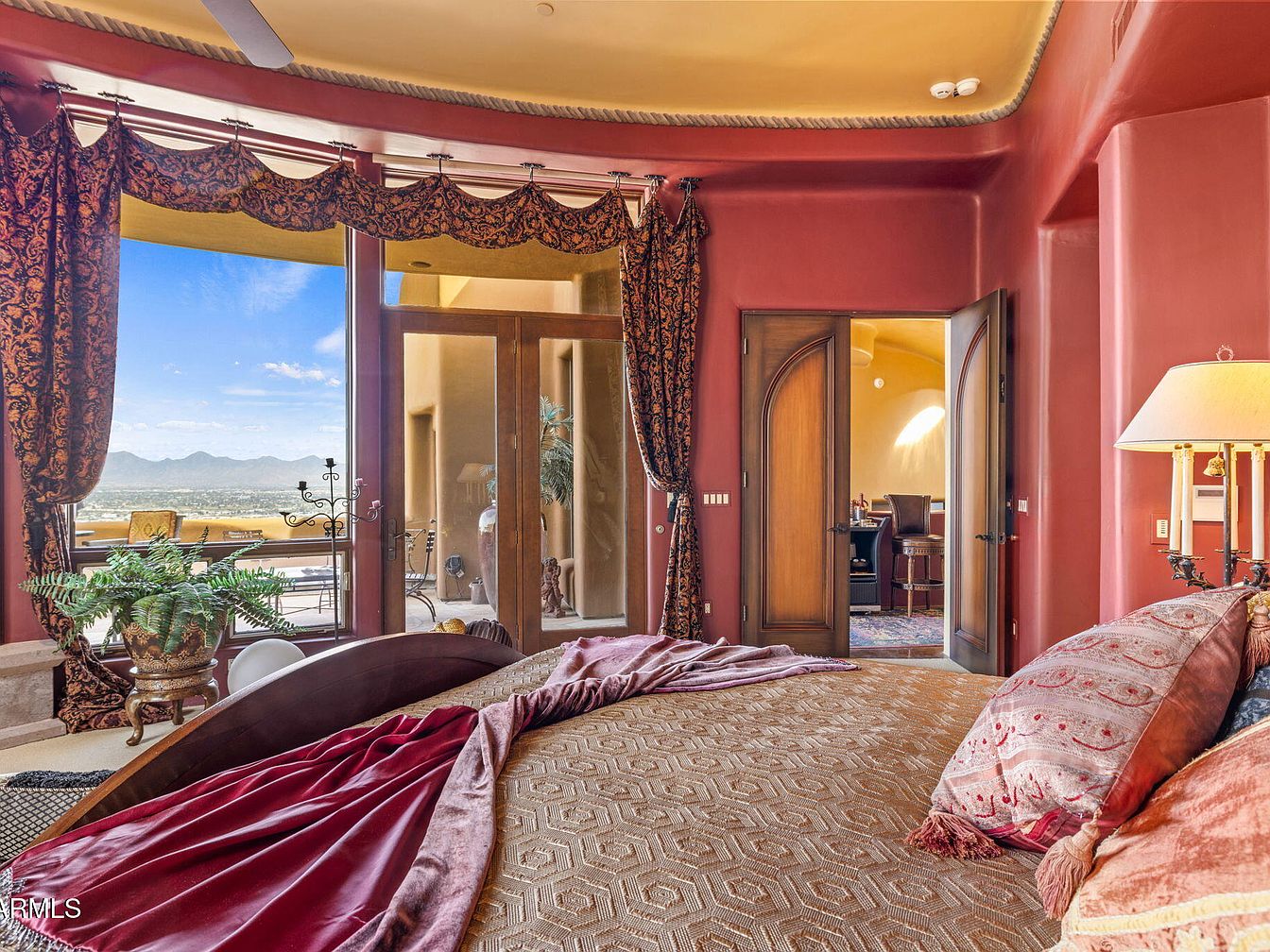 A luxurious bedroom with a rich color palette of deep reds and warm golds. The room features a grand curved window adorned with ornate, patterned drapes that frame a panoramic view of mountains. A plush bed with intricate, textured bedding is placed against the wall, while decorative pillows with varied patterns add depth. The architectural details include rounded corners and a high ceiling, enhancing the space’s grandeur. In the corner, a potted plant adds a touch of greenery, contrasting the warm tones. A doorway leads to an adjacent room, inviting exploration of the home.