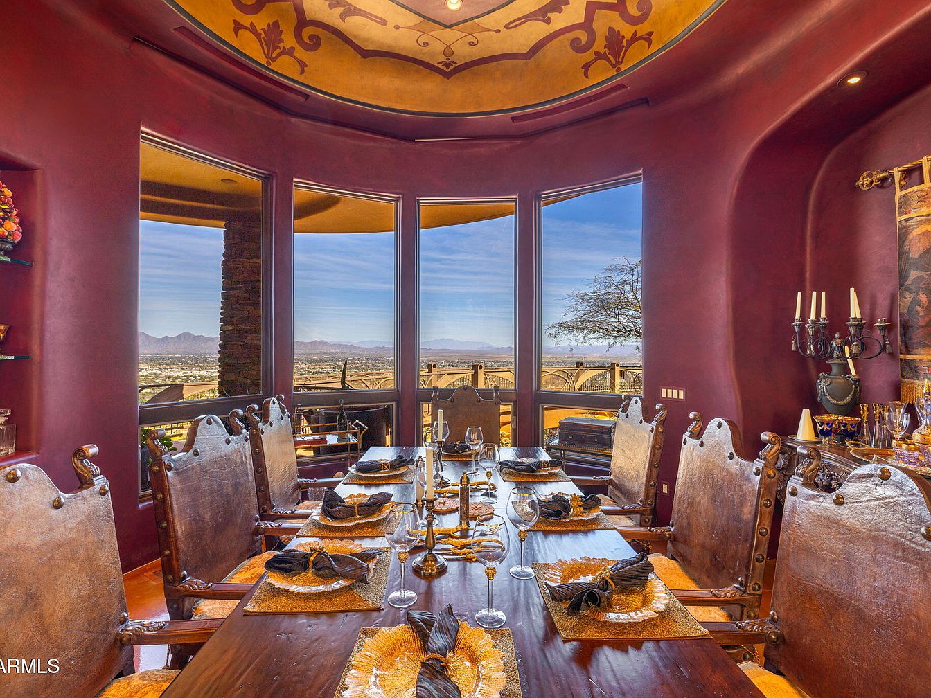 An elegant dining room with rustic charm features a large wooden table set for a gathering, surrounded by ornate, high-backed chairs. The walls are painted a deep, rich red, complementing the intricate ceiling artwork in warm tones. Expansive windows offer panoramic views of the landscape, inviting natural light and enhancing the space’s airy feel. Decorative elements include gold-accented table settings and a classic candelabra, adding sophistication. The natural stone column provides structural interest, creating a unique blend of modern elegance and traditional design, perfect for entertaining while showcasing the surrounding beauty.