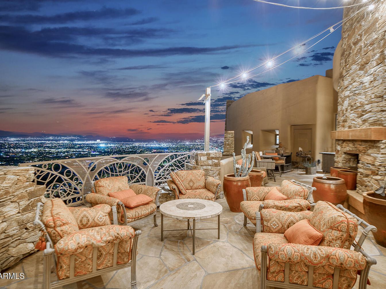This outdoor patio beautifully blends natural stone with warm textiles, showcasing a serene seating arrangement overlooking the city below. Plush armchairs, upholstered in intricate patterns with soft orange accents, invite relaxation. A circular stone table at the center complements the earthy colors of the larger stone walls and terracotta pots, which house native plants. Twinkling lights strung overhead enhance the evening ambiance, illuminating the space as the vibrant sunset casts a warm glow. The rustic fireplace adds a cozy touch, merging functionality with aesthetic charm, creating a perfect spot for gatherings under the expansive sky.