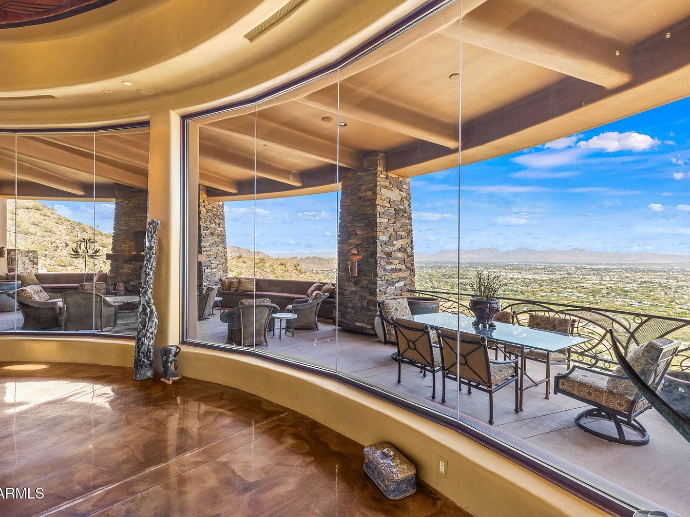 A spacious patio area showcases large curved glass walls that invite natural light while offering breathtaking views of the surrounding landscape. The warm neutral tones of the walls harmonize with the polished concrete floor, providing a contemporary feel. Furnishings feature a blend of woven textures, with a comfortable seating arrangement accented by decorative cushions. A glass-top dining table surrounded by elegant metal chairs enhances the inviting atmosphere. Architectural details include rustic stone columns, seamlessly merging modern design with nature. Potted plants add a touch of greenery, harmonizing with the serene sky visible through the expansive windows.