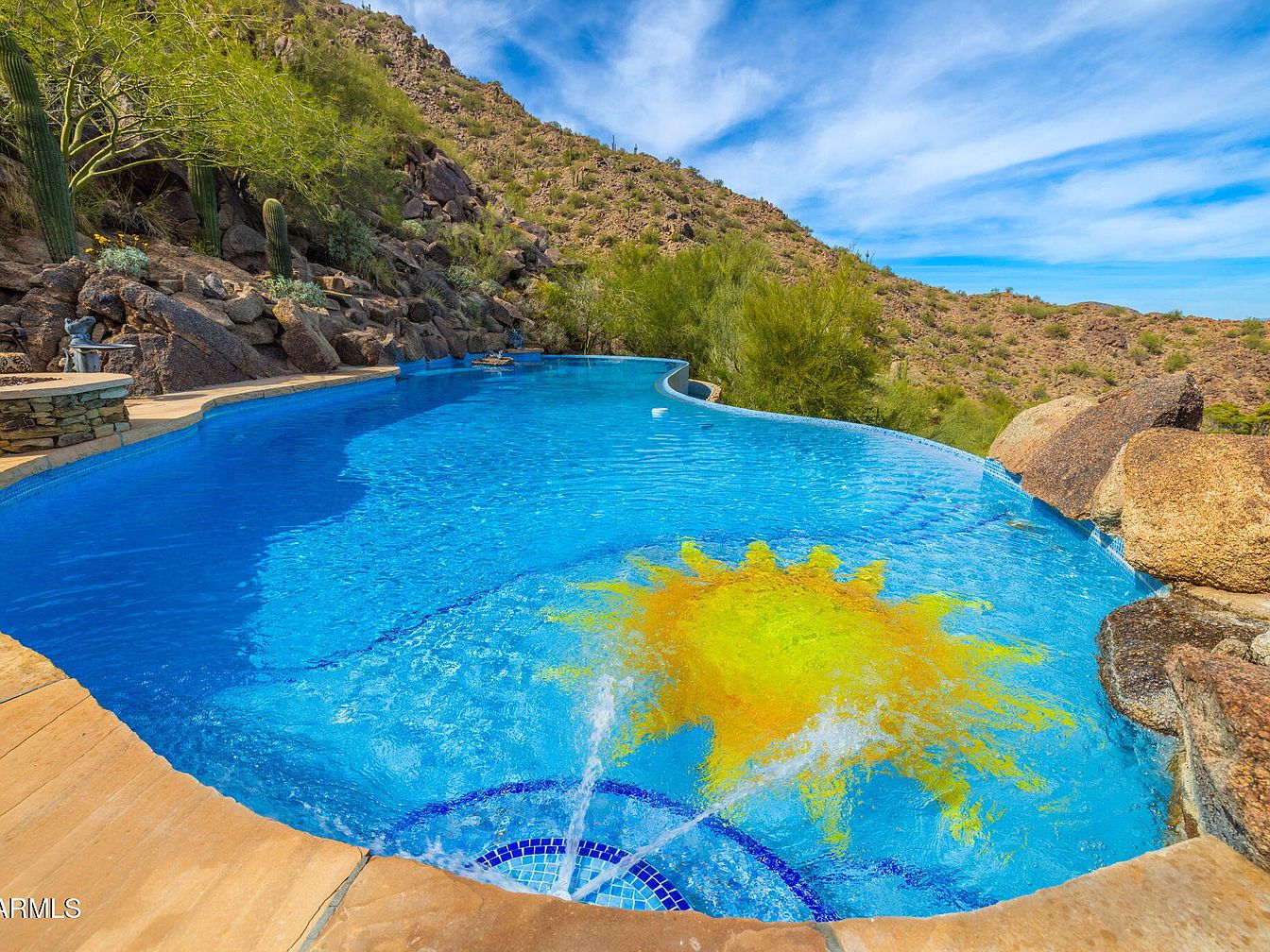 A stunning infinity pool merges seamlessly with the natural landscape, creating an illusion of water flowing into the horizon. The vibrant blue water contrasts beautifully against the rugged mountain backdrop, while a unique sun motif at the bottom adds a playful touch. Surrounding the pool area, large, smooth stones integrate natural elements into the design, with desert flora softly framing the space. The expansive pool deck features warm-toned stone tiles, inviting relaxation and leisure. Lush greenery and cacti are visible on the hillside, enhancing the outdoor experience, and the bright sky adds to the overall serenity.