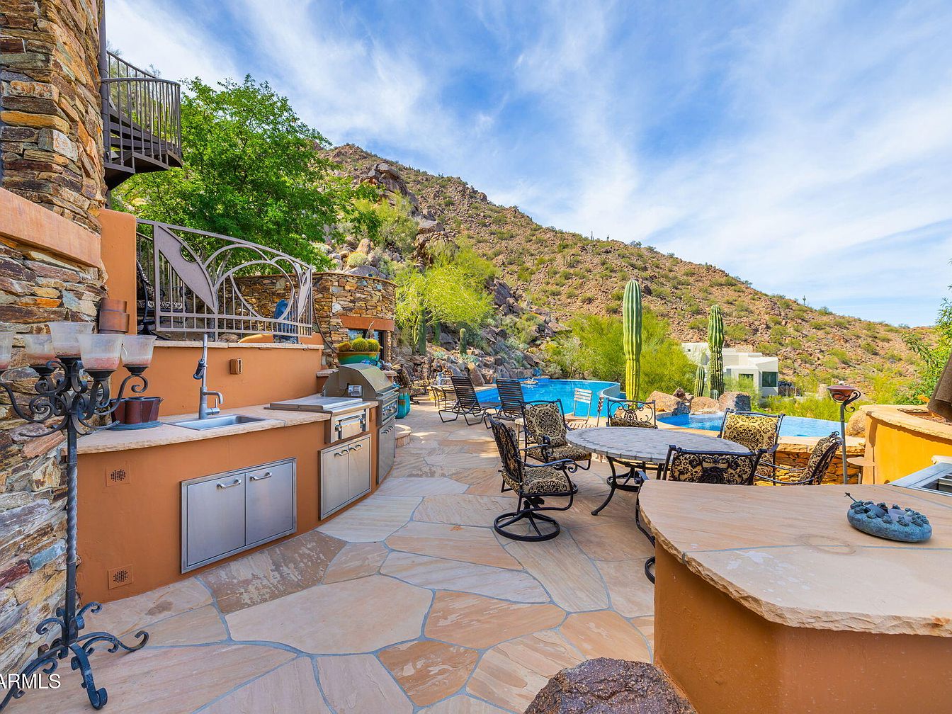 An inviting outdoor terrace displays an elegant stone kitchenette with a built-in grill and sleek stainless steel fixtures. The warm, earthy tones of the stucco and rock blend harmoniously with the natural landscape. A round dining table surrounded by ornate wrought iron chairs offers a perfect spot for al fresco dining against a picturesque backdrop of the rugged mountains. Lush greenery and tall cacti accentuate the serene setting. The flagstone patio flows seamlessly, with gentle curves leading to a stunning pool area, creating an inviting atmosphere ideal for relaxation and entertaining in the open air.