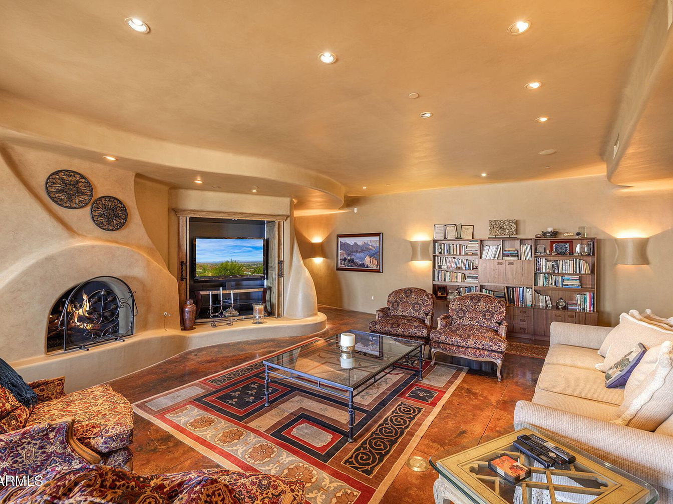 This living room features a unique, organic architectural design with smooth, rounded walls and a cozy fireplace. The warm, earthy color palette uses soft beige and terracotta tones, enhancing the inviting atmosphere. Two patterned armchairs complement a cream-colored sectional, creating a comfortable seating arrangement. A low glass coffee table sits in the center, showcasing books and decorative items. A vibrant area rug adds an intricate design beneath. A built-in shelving unit filled with books and a framed landscape art piece enrich the space, while recessed lighting and wall sconces illuminate the room, creating a warm ambiance.