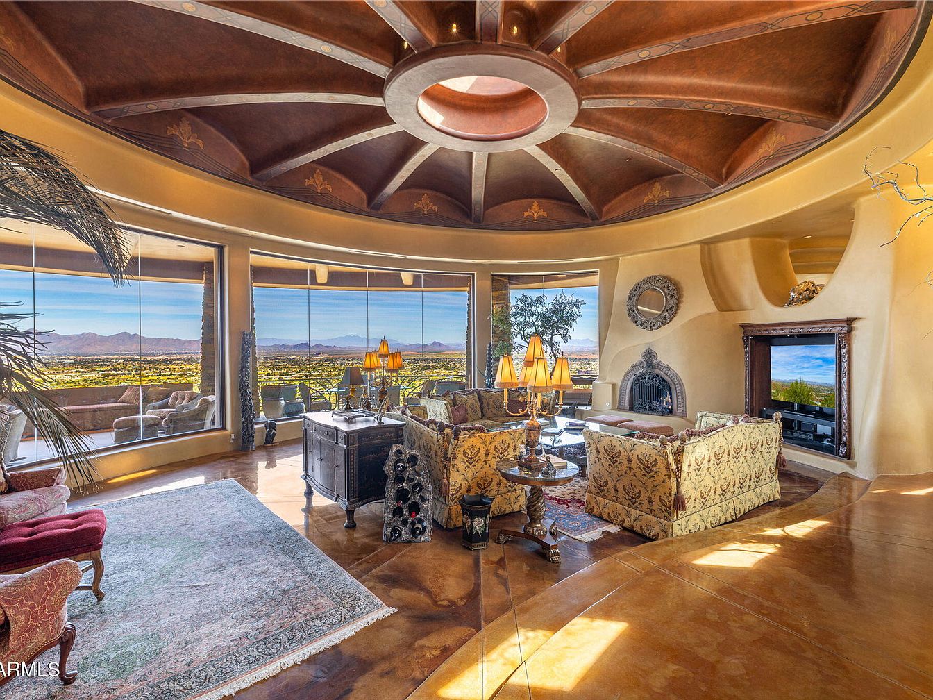 A spacious living room featuring a circular layout with large panoramic windows showcasing stunning mountain views. The ceiling exhibits intricate designs in warm tones, complementing the golden walls. Plush sofas, upholstered in rich floral patterns, surround a polished coffee table with an elegant lamp. A vintage armchair in a deep red hue contrasts with the muted palette. Decorative accents include an ornate fireplace built into the wall and tasteful wall art enhancing the room’s elegance. A soft area rug underfoot adds warmth, while the glossy concrete floor reflects ambient light, creating a cozy yet luxurious atmosphere.