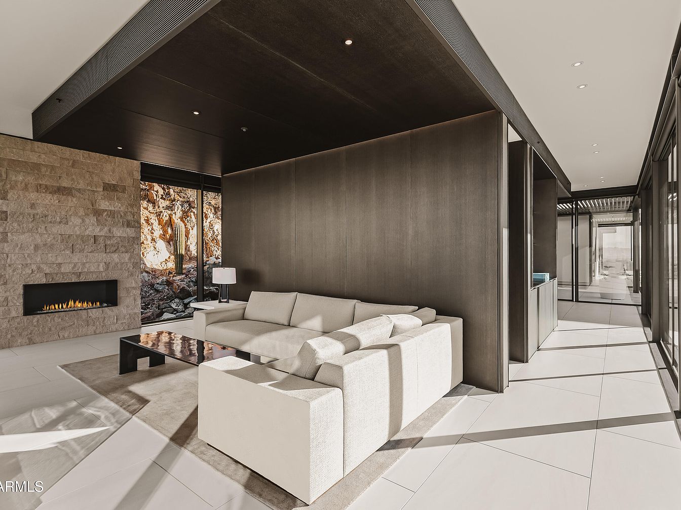 This modern living room features a spacious and open layout, seamlessly connecting with natural light through expansive glass walls. A sleek, light-colored sectional sofa provides comfort, paired with a dark coffee table that contrasts against the soft-toned flooring. A minimalist stone wall houses a linear gas fireplace, enhancing the room’s contemporary aesthetic. The ceiling is adorned with dark panels, creating a striking visual contrast. Adjacent spaces include a sleek side table with a lamp, emphasizing simplicity in design. The overall color palette combines soft neutrals with dark accents, promoting a serene and inviting atmosphere.