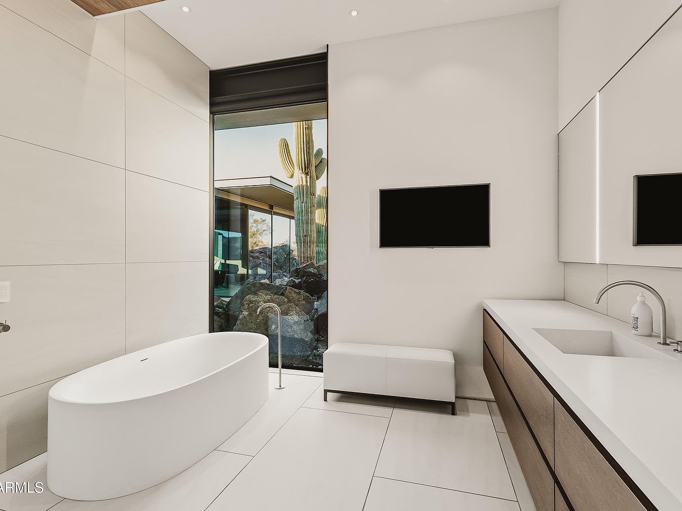 A modern bathroom featuring a freestanding oval bathtub as the focal point, positioned against a wall of sleek, light-colored tiles. The color palette is neutral with soft whites and light wood accents. A contemporary vanity with clean lines showcases a quartz countertop paired with wooden cabinetry. Adjacent to the bathtub, a large window invites natural light and offers a view of desert landscaping, creating a serene ambiance. Minimalist design elements are evident, including recessed lighting and a mounted flat-screen TV, enhancing the space’s functionality and elegance while maintaining an uncluttered aesthetic.
