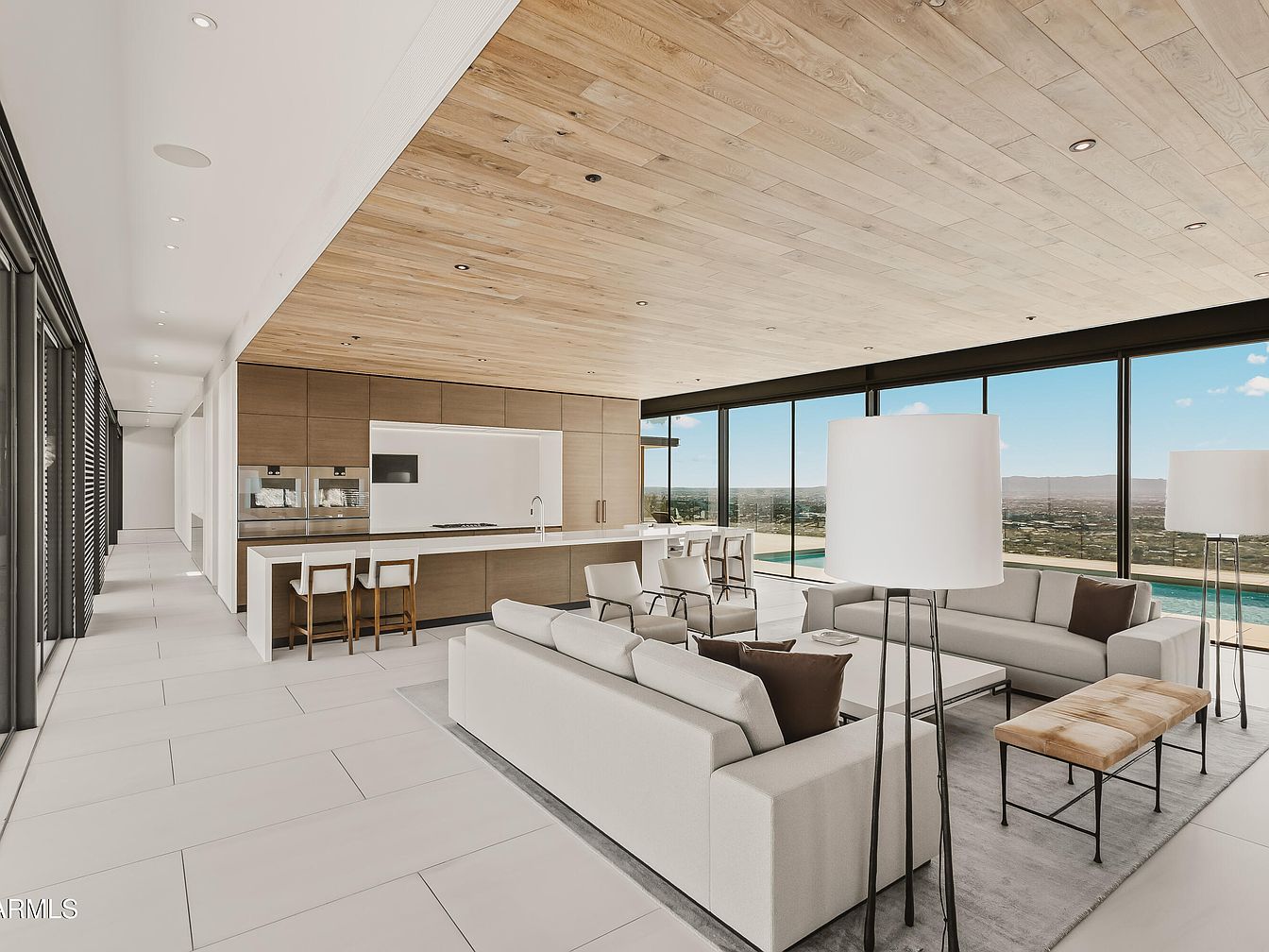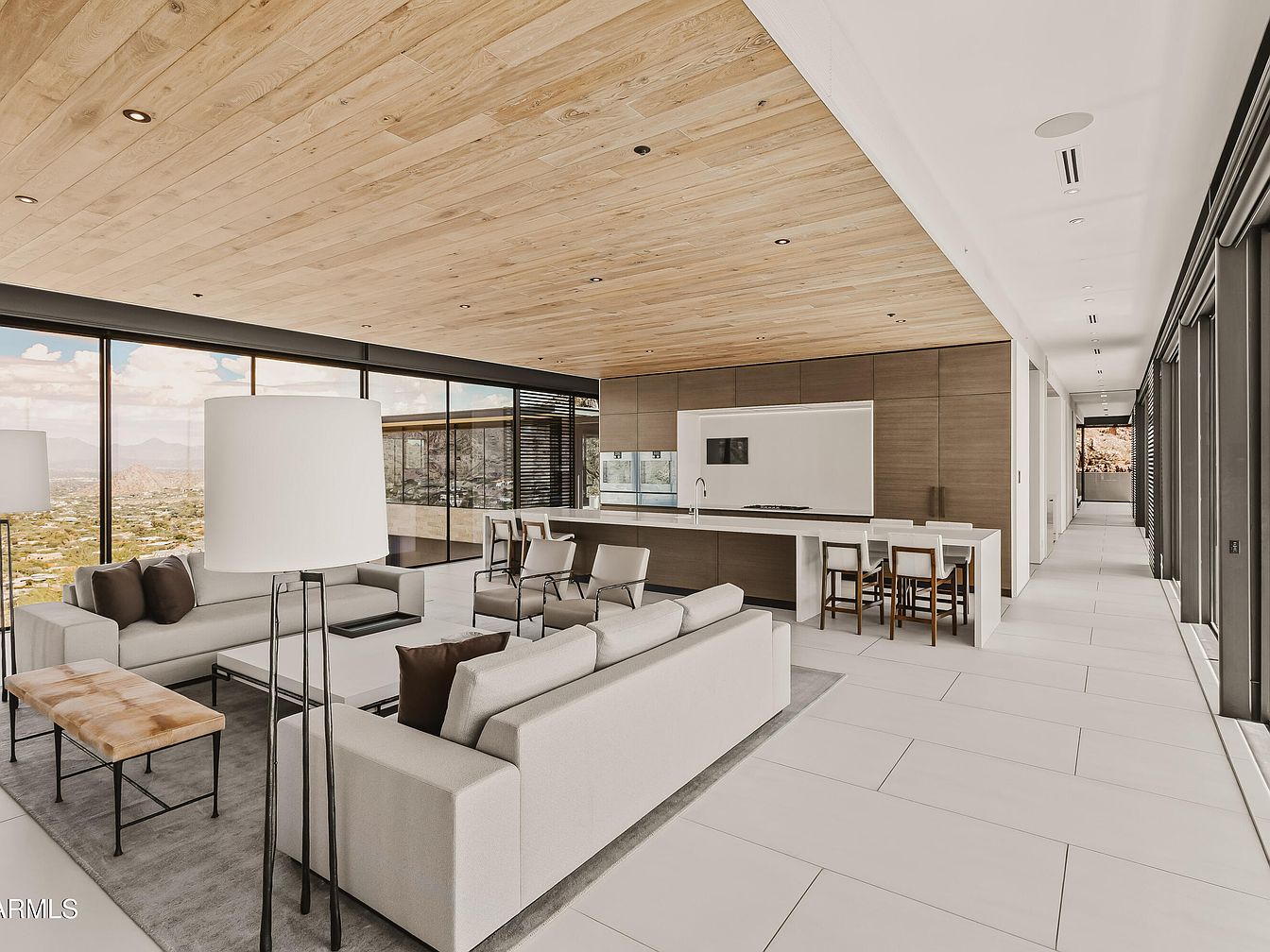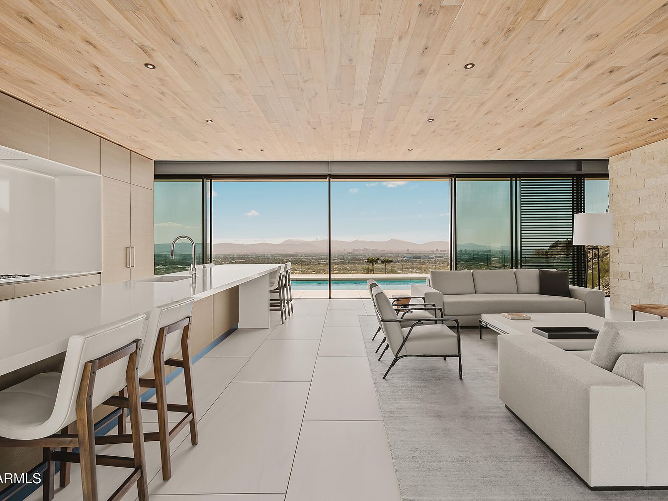 This modern living room features an open layout with expansive glass walls, offering stunning mountain views. A light wood ceiling contrasts with sleek white walls and large, neutral tiles. The seating area is adorned with a plush gray sectional and minimalist armchairs, enhancing comfort while maintaining a contemporary aesthetic. A low coffee table sits atop a soft rug, providing a cozy touch. Adjacent, a long kitchen island with a white countertop is complemented by wooden barstools, merging functionality with style. Natural light floods the space, highlighting the blend of indoor and outdoor elements, inviting relaxation and social gatherings.