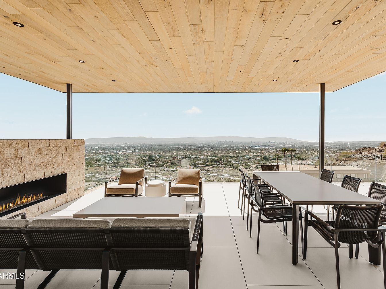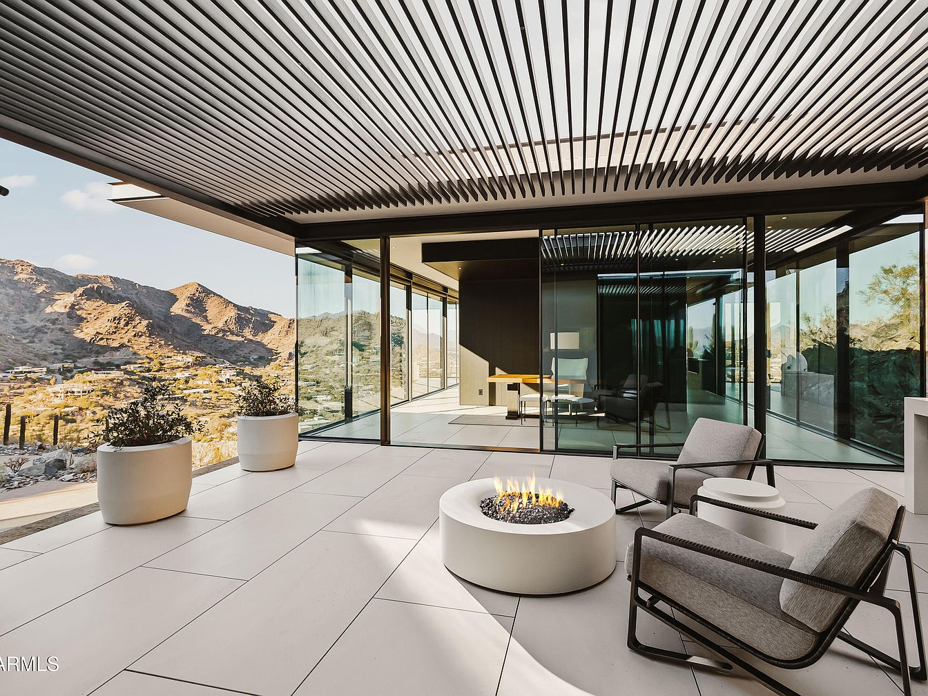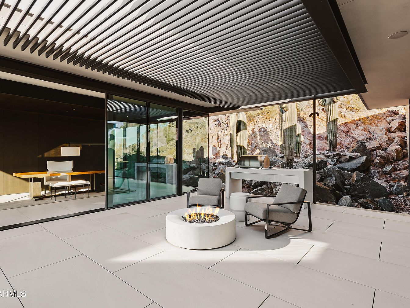 This contemporary patio features a spacious layout with a clean, modern aesthetic. The flooring showcases large, light-colored tiles that enhance openness. A circular fire pit serves as a focal point, surrounded by sleek, comfortable chairs in muted tones. Adjacent, a minimalist outdoor dining table is paired with elegant white chairs, creating a harmonious dining setup. The expansive glass walls seamlessly integrate the interior and exterior, allowing natural light to flood the space while providing stunning views of the surrounding rocky landscape and cacti. A slatted overhead structure offers shade while enhancing the contemporary design.