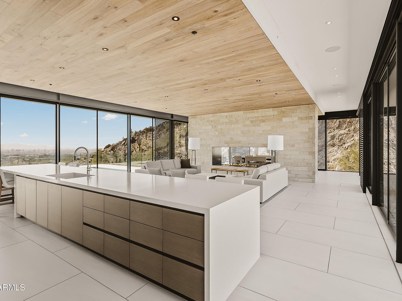 This kitchen features a spacious layout with a long island counter, showcasing a sleek white surface paired with contemporary cabinetry comprising brushed metal finishes. The light wood ceiling enhances warmth, contrasting with the clean, white walls and expansive glass windows that offer panoramic mountain views. Natural light floods the area, highlighting the minimalist furnishings, including a soft gray sofa and modern accent chair. The stone wall serves as an intriguing textural element, while the polished tile flooring maintains a seamless flow throughout the space, exemplifying a refined balance between modern design and natural beauty.
