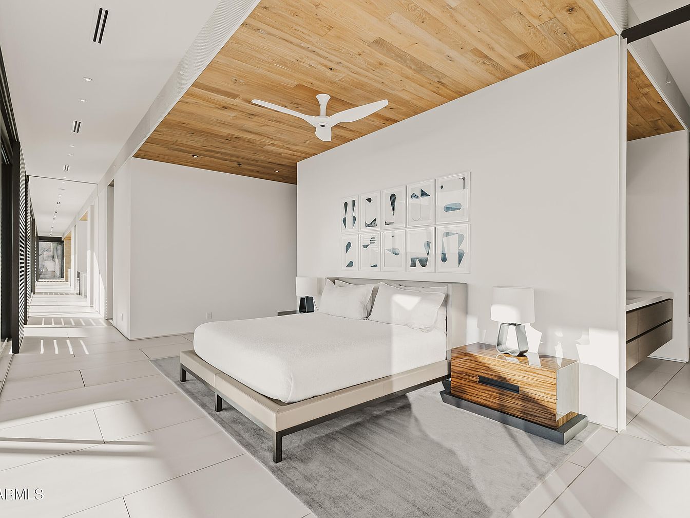 The bedroom features a spacious and minimalist design, highlighted by a natural wood ceiling that adds warmth to the space. Light-colored walls and large windows create an airy atmosphere filled with natural light, complemented by sleek, neutral-toned flooring. A large, modern bed sits centrally, adorned with crisp white linens, alongside a stylish nightstand featuring a unique wood pattern. Adjacent to the bed, a contemporary lamp offers soft illumination. Geometric art pieces hang on the wall, contributing to the modern aesthetic. The overall palette is calm and inviting, with elements that merge comfort with sophistication.