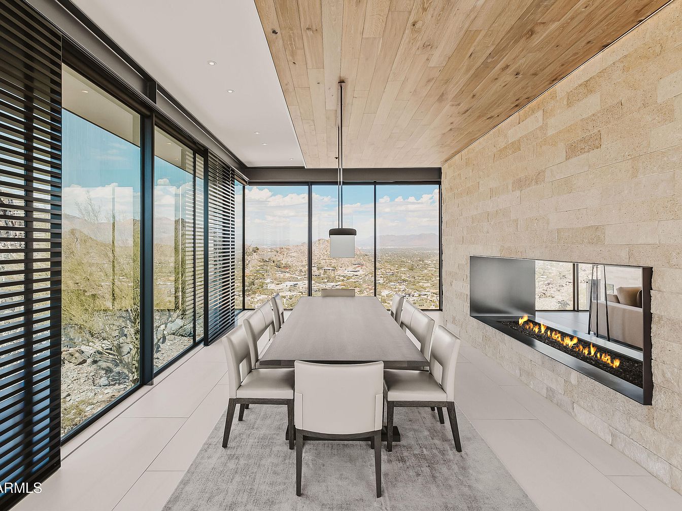 This dining room features a sleek, modern design with large glass walls offering breathtaking views of the surrounding landscape. The floor is adorned with large light-colored tiles, complementing the neutral stone wall. A long, contemporary wooden dining table is centered in the space, surrounded by stylish white chairs that emphasize simplicity and elegance. Warm wood paneling on the ceiling adds a touch of warmth, while a minimalist linear pendant light provides ambient illumination. A low, linear fireplace embedded in the stone wall serves as a focal point, enhancing the room’s cozy yet sophisticated atmosphere.