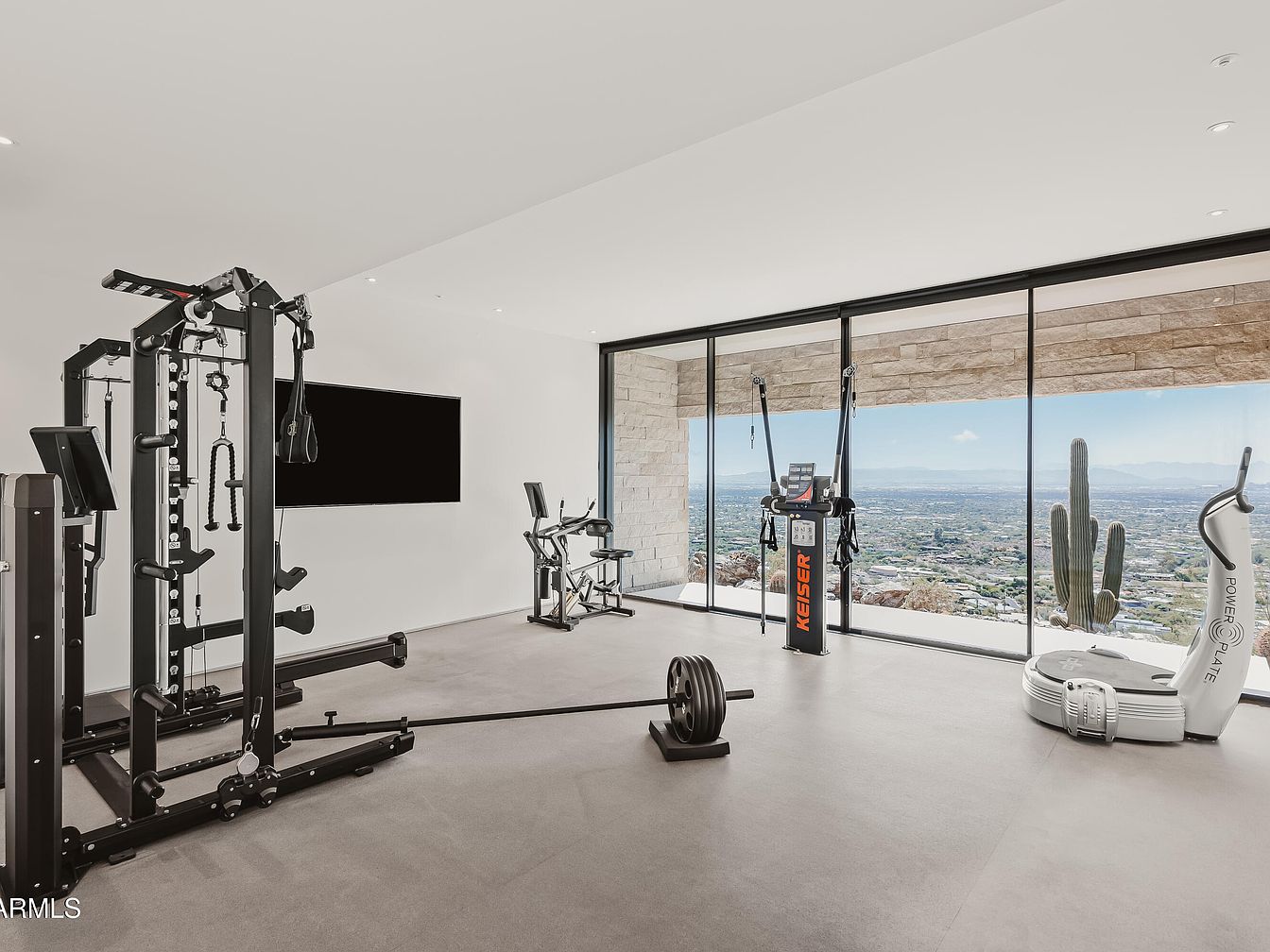 This home gym features an open layout with expansive glass walls that provide stunning views of the surrounding landscape. The walls are minimalistic and painted in soft white, enhancing the sense of space. Various modern gym equipment occupies the center, including a multi-station weight machine, exercise bike, and innovative vibration plate. The flooring is a sleek, light-colored material that complements the overall aesthetic. A large flat-screen TV is mounted on the wall for entertainment during workouts. Natural elements, such as a cactus placed near the window, add a touch of nature to this contemporary fitness space.