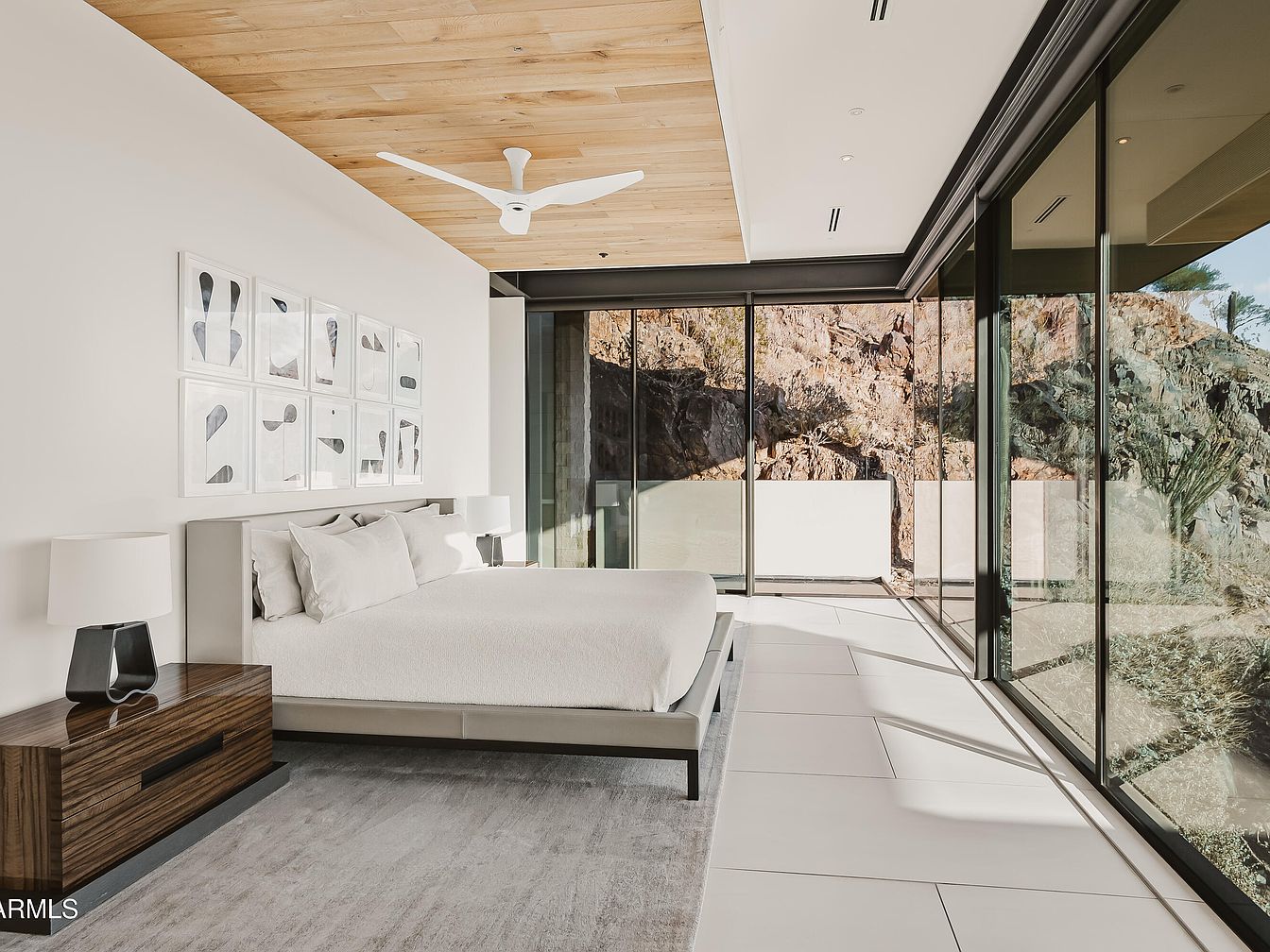 The bedroom features a modern aesthetic with a minimalist design. A large, plush bed with light-colored linens is positioned centrally. Warm wood tones from the ceiling contrast with the white walls, creating an inviting atmosphere. Two sleek bedside lamps sit atop a dark wood nightstand, enhancing the room’s elegance. Expansive glass panels serve as walls, inviting natural light and offering stunning views of a rocky landscape. The flooring is a smooth, light-hued tile, contributing to the airy ambiance. Subtle artwork hangs above the bed, adding a touch of sophistication without overwhelming the space.