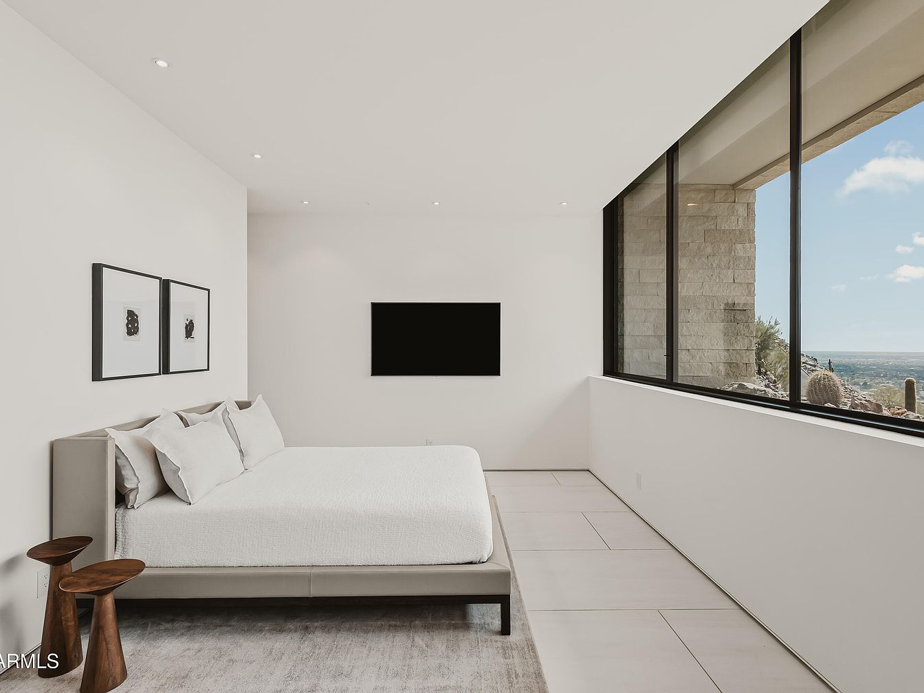 The bedroom features a minimalist design with a neutral color palette, primarily white walls and light-colored tiled flooring. A contemporary queen-sized bed with a light gray upholstered headboard sits against one wall, adorned with soft white bedding and several plump pillows. On either side, round wooden end tables provide simple contrast. Above the bed, two framed art pieces add a touch of elegance. A flat-screen television mounted on the wall opposite the bed creates a modern touch. Expansive floor-to-ceiling windows allow natural light to flood the space, revealing a stunning view of the landscape.