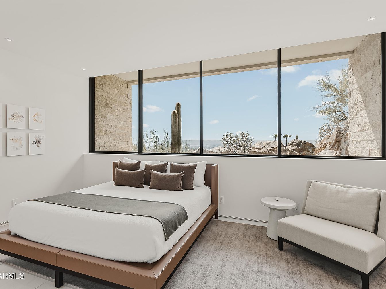 A modern bedroom featuring a low-profile bed with a plush white comforter and dark gray accent blanket. A trio of decorative pillows adds a touch of comfort. The room is softly illuminated by natural light filtering through expansive floor-to-ceiling windows that offer panoramic views of striking desert landscapes. A beige lounge chair sits adjacent to a sleek side table, enhancing the cozy aesthetic. The walls are painted in a subtle off-white, complementing the light wood flooring. Abstract artwork is displayed on one wall, providing a minimalist yet artistic touch, harmonizing perfectly with the room’s serene vibe.