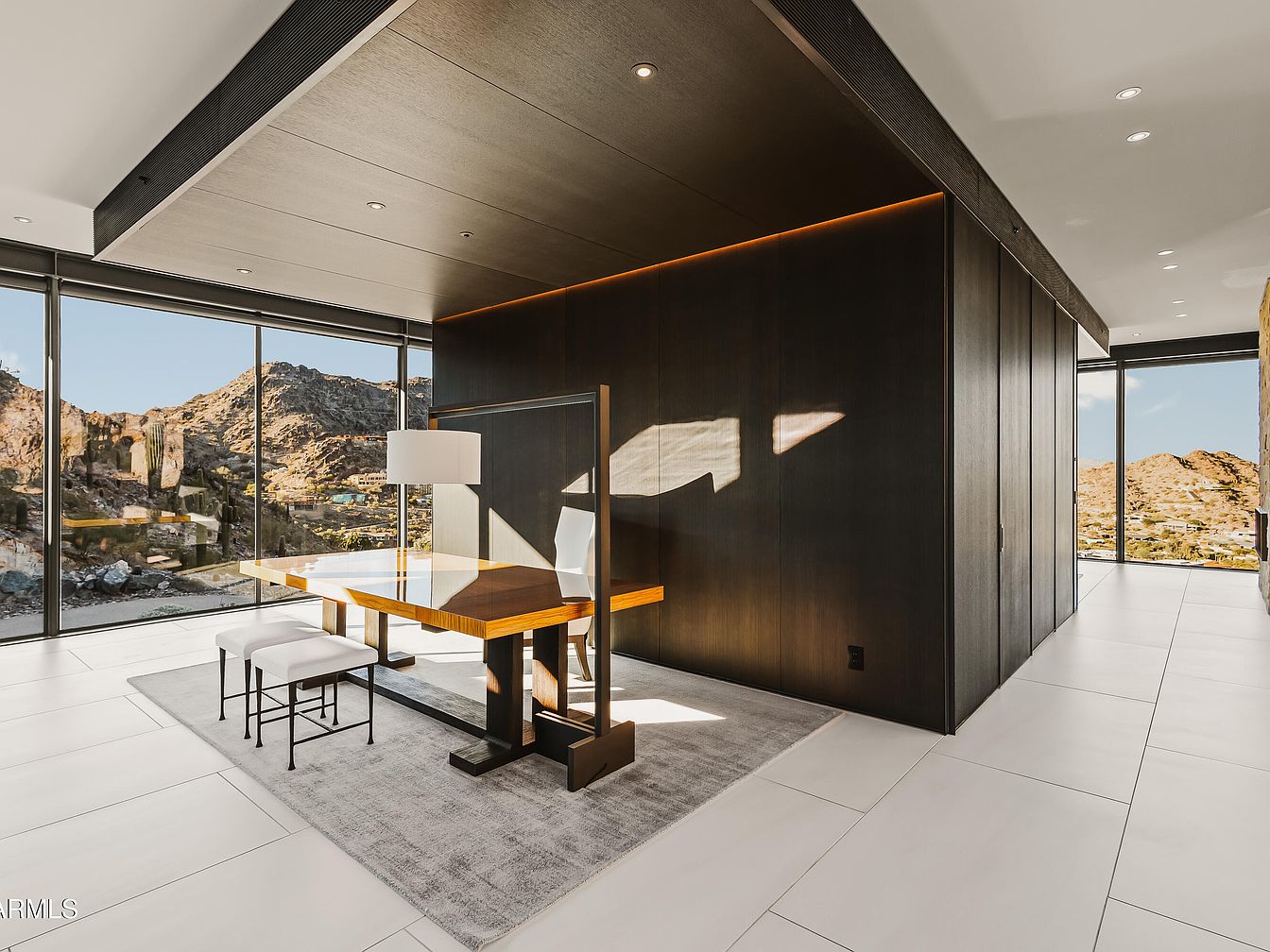 The space features a contemporary home office with a sleek, modern design. A large, minimalist wooden desk stands at the center, complemented by white upholstered chairs. The walls are adorned with dark wood paneling, creating an intimate atmosphere. An expansive window showcases a breathtaking mountainous landscape, flooding the room with natural light. The flooring consists of large, white tiles that enhance the room’s airy feel. Soft lighting from recessed ceiling fixtures accentuates the architectural lines, while a textured rug grounds the furniture arrangement, providing warmth to the otherwise crisp environment. Overall, a harmonious blend of style and functionality.