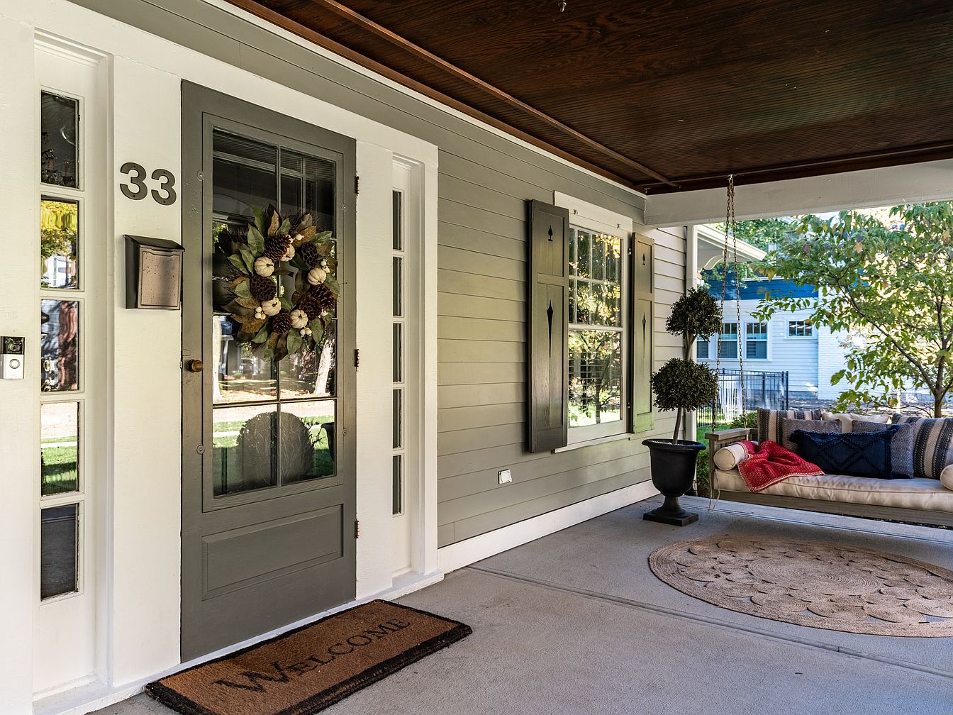 A charming front porch features a muted sage-green door adorned with an autumn-inspired wreath, framed by vertical windows and flanked by white trim. The number 33 is mounted in sleek silver beside a metal mailbox. The house siding is painted in a gentle gray-green, complemented by a dark wood ceiling above. To the right, a set of classic shutters frame the window, and beneath it sits a potted topiary in a black planter. A cozy porch swing, layered with pillows and a red throw, rests beside a circular woven rug, offering an inviting space surrounded by lush greenery and natural light.
