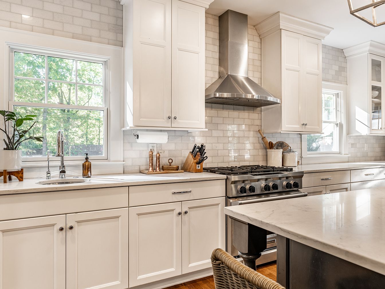 Bright, airy kitchen features classic white cabinetry with simple paneling and chrome hardware. Warm natural light pours in through two large windows above the sleek marble countertops and under-mount sink. The white subway tile backsplash runs from counter to ceiling, creating a clean backdrop for the stainless steel gas stove and modern range hood. A tidy array of copper utensils, a knife block, glass canisters, and a potted plant add warmth and function to the space. The central island offers extra prep surface with its matching marble counter, and a woven stool tucked nearby hints at a cozy breakfast nook.
