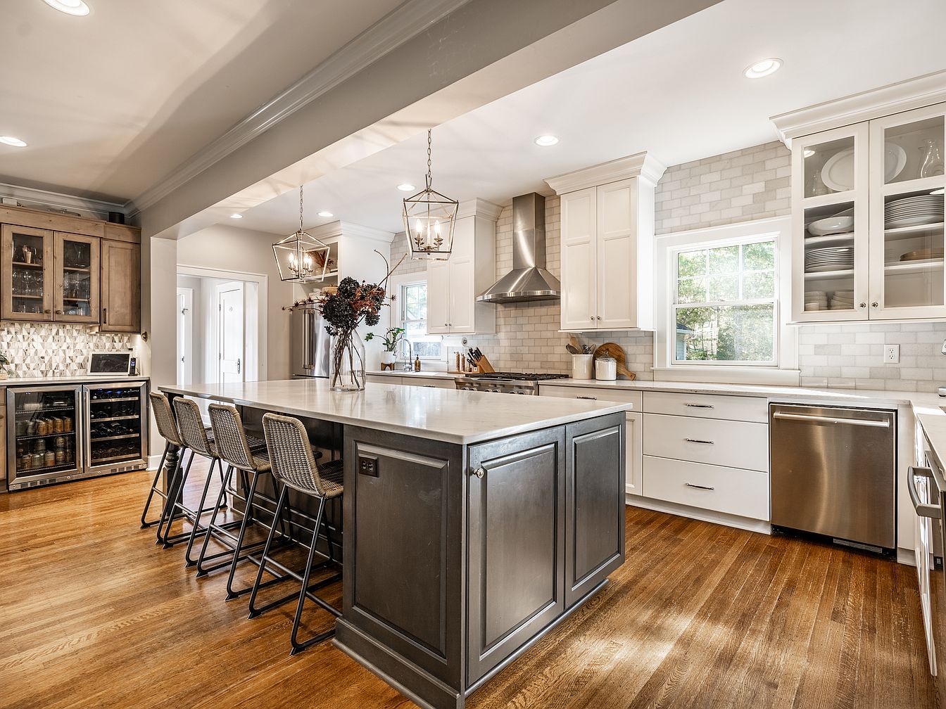 A spacious kitchen with a large central island featuring a sturdy stone countertop and charcoal base. Four woven-seated barstools line one side for casual dining. Warm wooden floors balance the clean white cabinetry along the back wall. Two geometric pendant lights hang above the island, adding modern elegance. The backsplash is made of pale subway tiles, enhancing the room’s brightness. A stainless steel range hood is centered over the stove, with glass-fronted cabinets showcasing dishes nearby. At the side, a pair of wine coolers and a mosaic-tiled wall add visual interest, while natural light streams through a window.