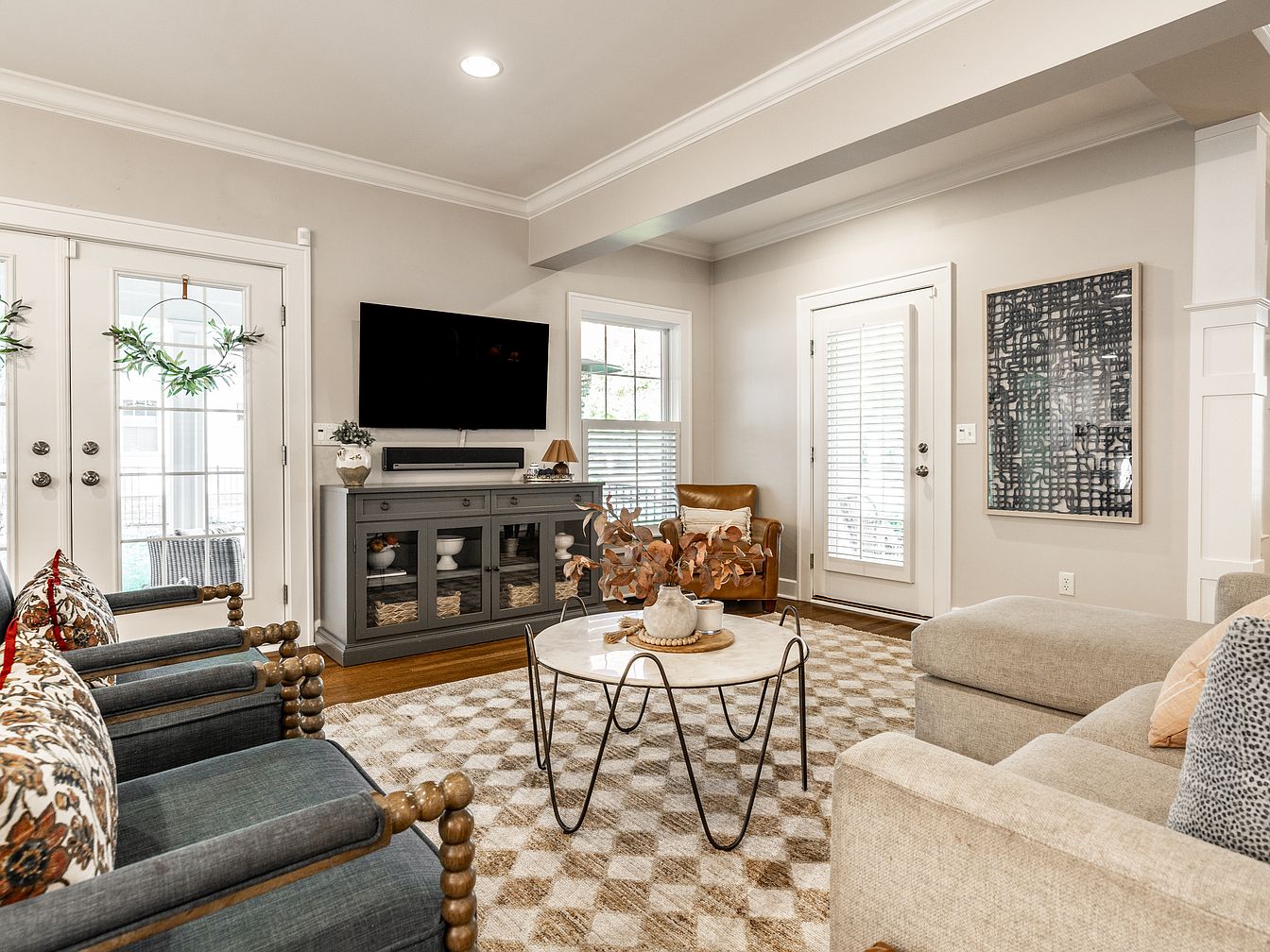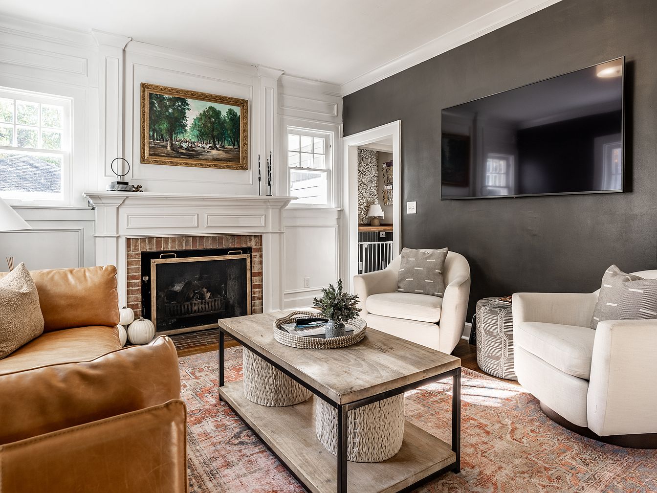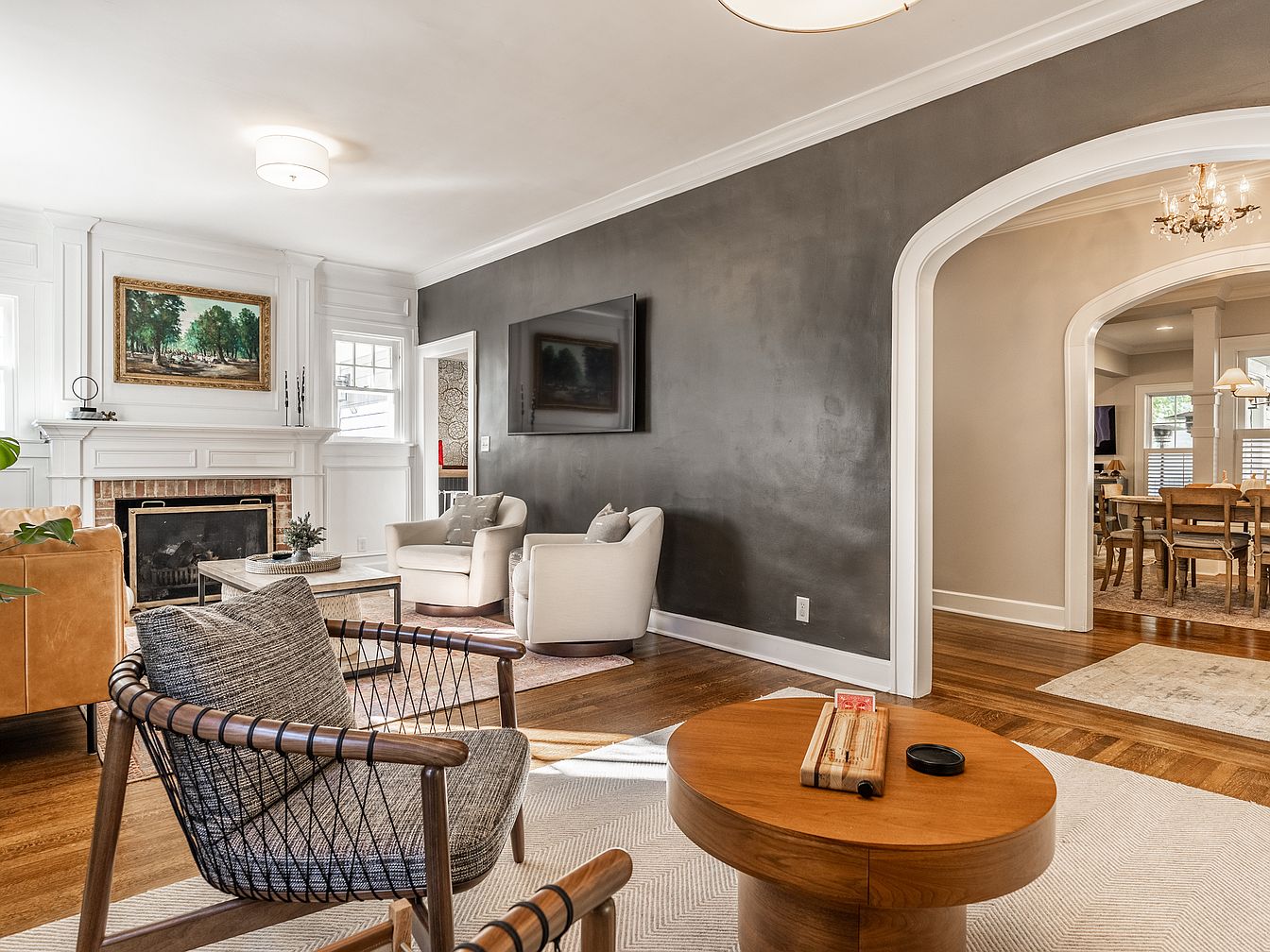 This space features a stylish living room with a warm and inviting atmosphere. The hardwood floors and crisp white crown molding create a historic yet contemporary feel. A striking black accent wall highlights a mounted flat-screen TV, while an elegant white mantel surrounds a brick fireplace, topped with a landscape painting in a gilded frame. The furniture includes a caramel leather sofa, two boucle swivel chairs, and a lounge chair with a wooden frame and woven back. A round wood coffee table sits atop a soft neutral rug, and large arched doorways lead into an adjacent dining area, showcasing the home’s classic architectural details.