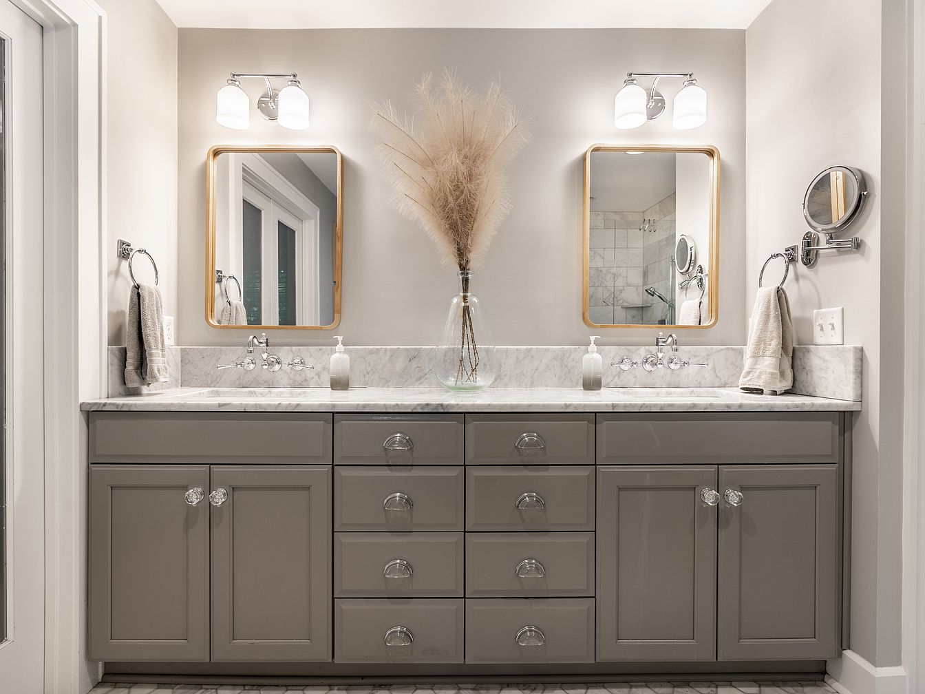 A symmetrical double-sink bathroom vanity with light grey cabinetry and marble countertops takes center stage. The wall above the vanity is a soft beige, and each sink has a rectangular, gold-framed mirror, with two frosted glass sconces mounted above for soft illumination. Central between the sinks, a tall glass vase with plumes of pampas grass adds a touch of organic elegance. Clear glass cabinet pulls and chrome fixtures provide a polished accent. Neatly rolled towels hang from chrome rings on each side, while subtle, neutral tones throughout create a calming and sophisticated space with a blend of modern and classic elements.