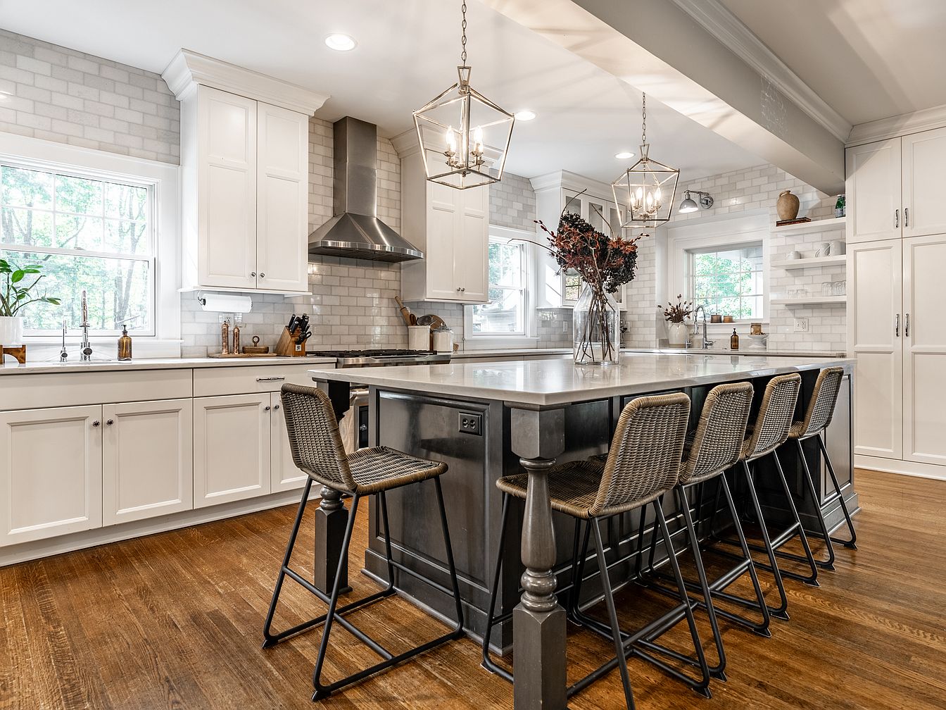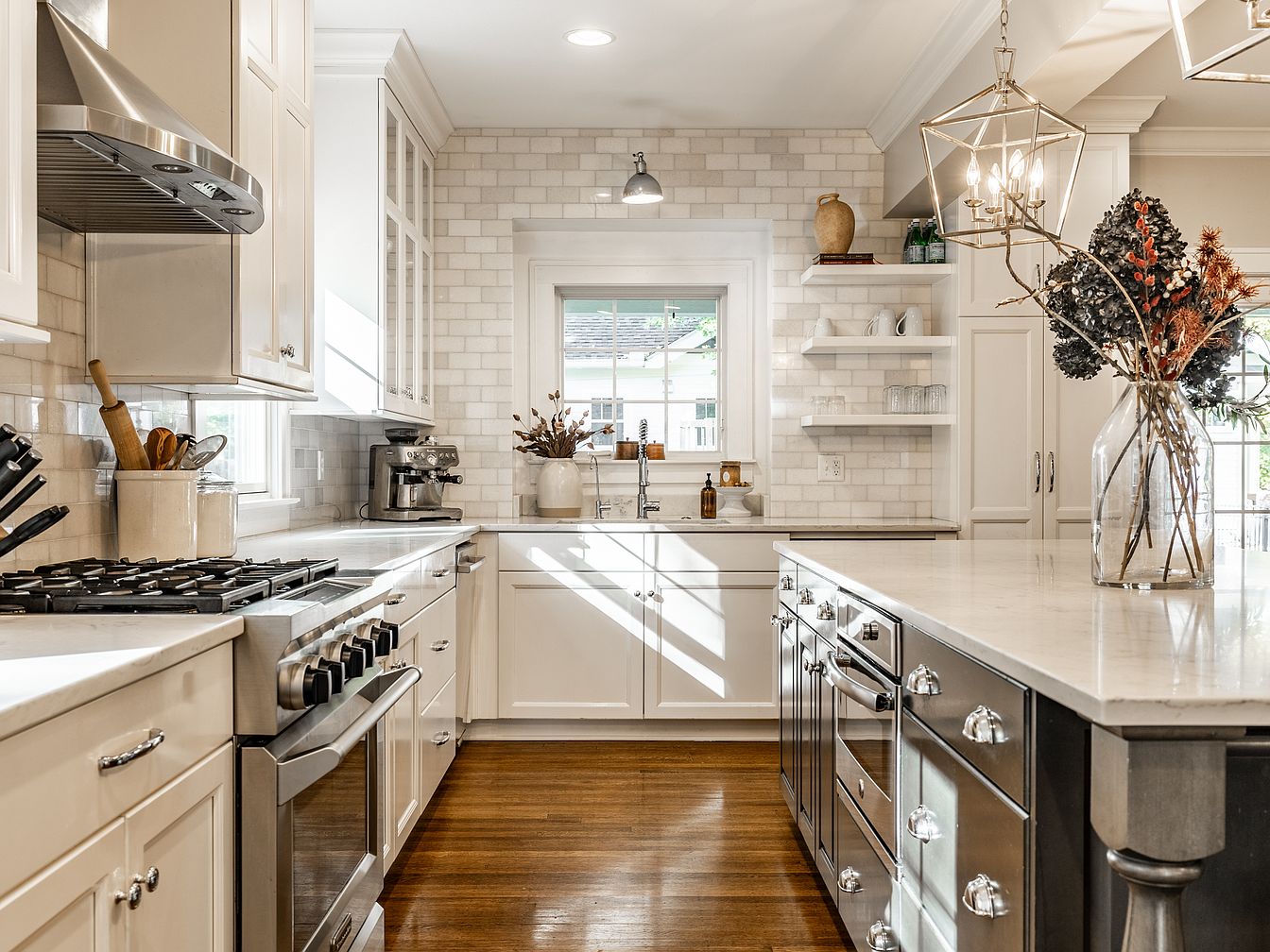 A bright, airy kitchen with a classic design features white cabinetry, marble countertops, and subway tile backsplash throughout. A large center island with dark cabinetry and polished marble surface dominates the foreground, adorned with a glass vase holding an arrangement of dried botanicals. Stainless steel appliances, including a gas stove and range hood, add a modern touch, while open shelves display glassware and subtle decor pieces. Natural light pours in from a window above the sink, complemented by elegant pendant lighting. Warm wood flooring grounds the space, creating a harmonious blend of historic charm and contemporary style.