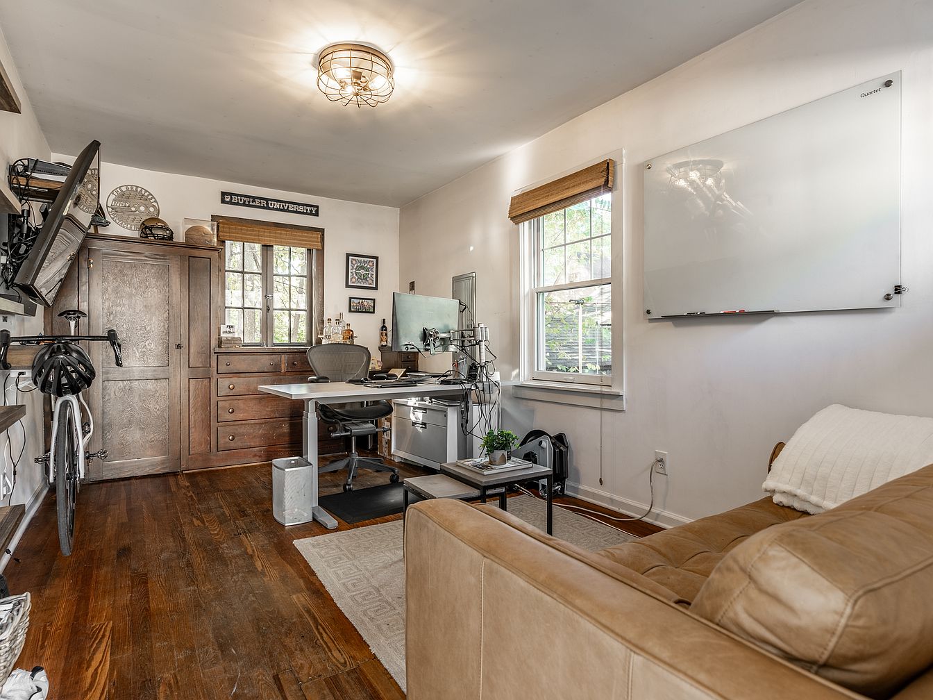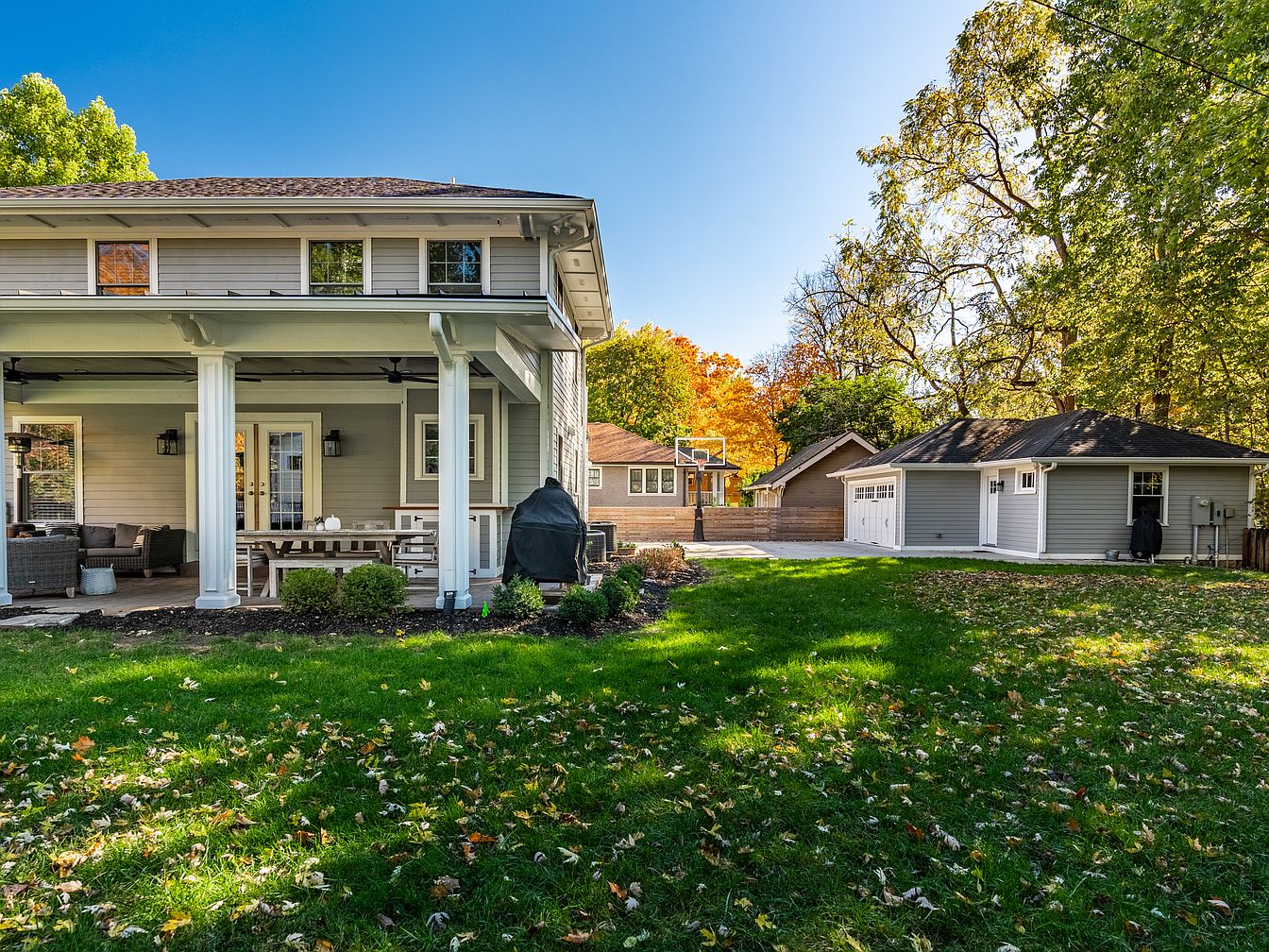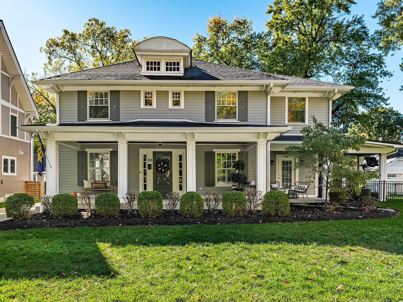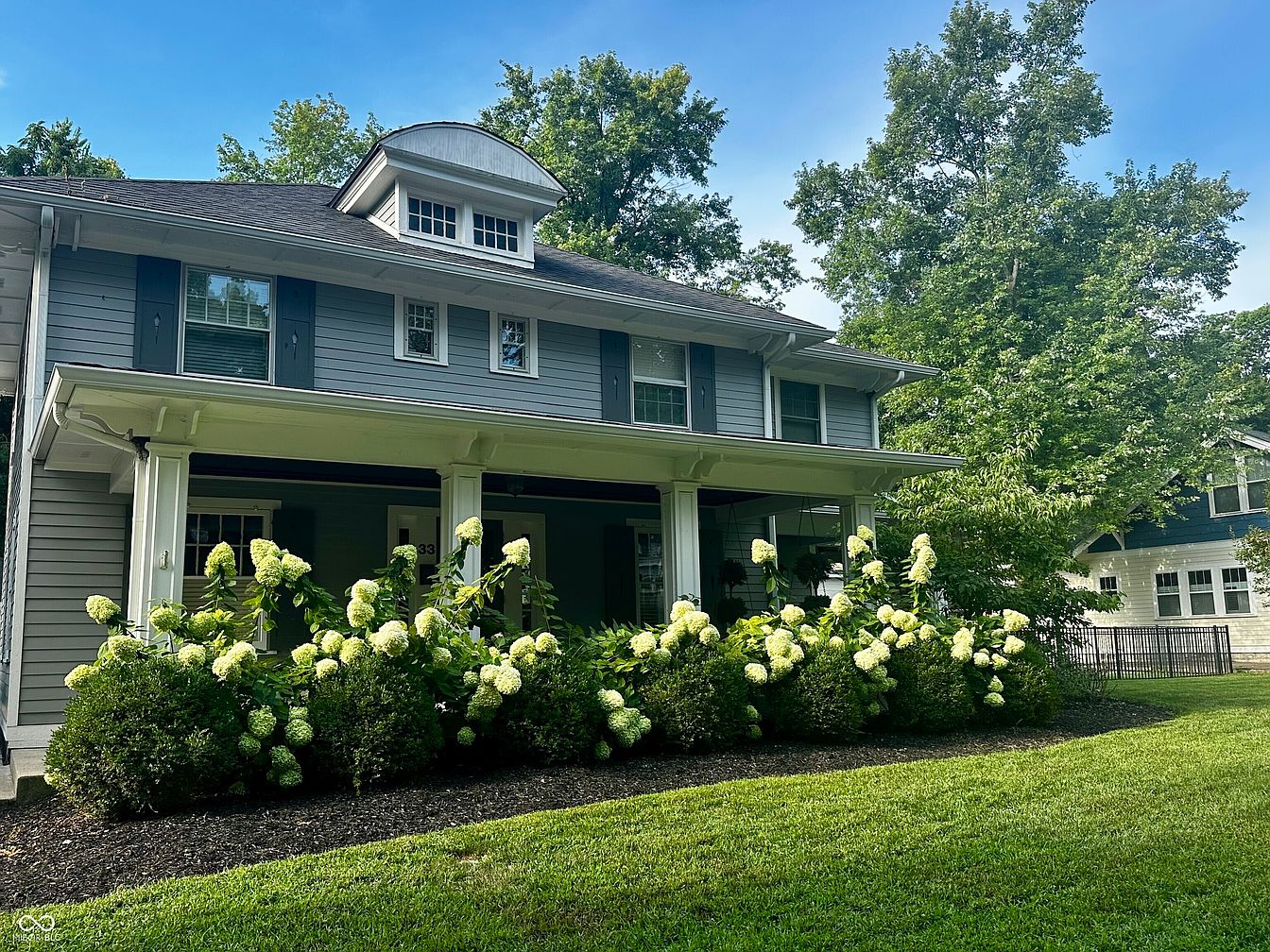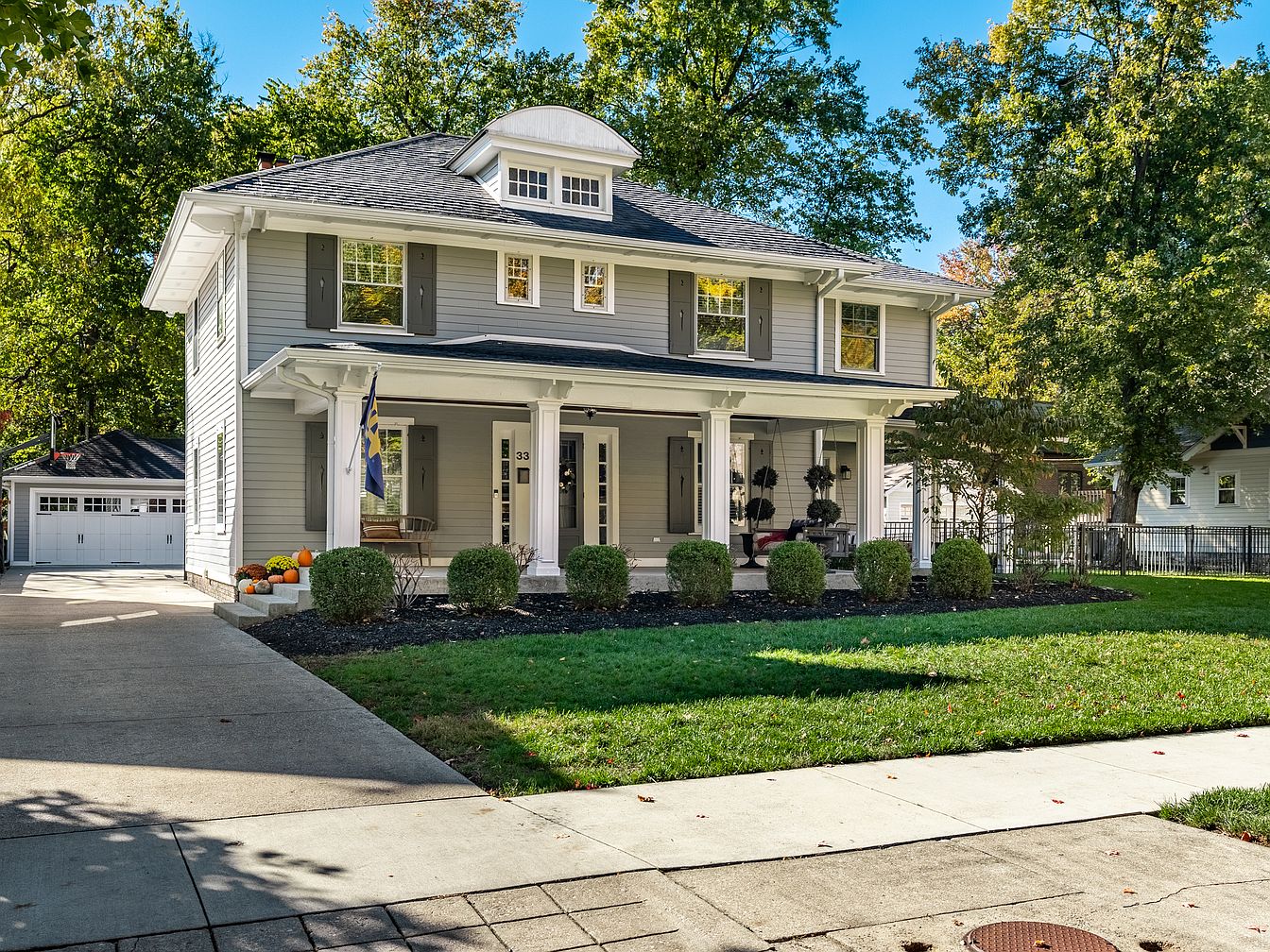Situated in the prestigious and historic Butler Tarkington neighborhood of Indianapolis, this exquisitely renovated century home exemplifies early 20th-century American architectural elegance with its deep, welcoming front porches and Craftsman-inspired details. Priced at $1,250,000 and resting on a rare one-third acre lot, the home combines preserved original hardwood floors with a contemporary open-concept transformation that seamlessly joins the kitchen, dining, and family spaces. The luxurious main floor features a gourmet kitchen with dual dishwashers and a six-burner range, while the upper level boasts a refined primary suite and private balcony. Recent upgrades include a renovated detached garage with office space, sophisticated built-ins, and impeccably landscaped grounds, making this estate an icon of comfort and style.