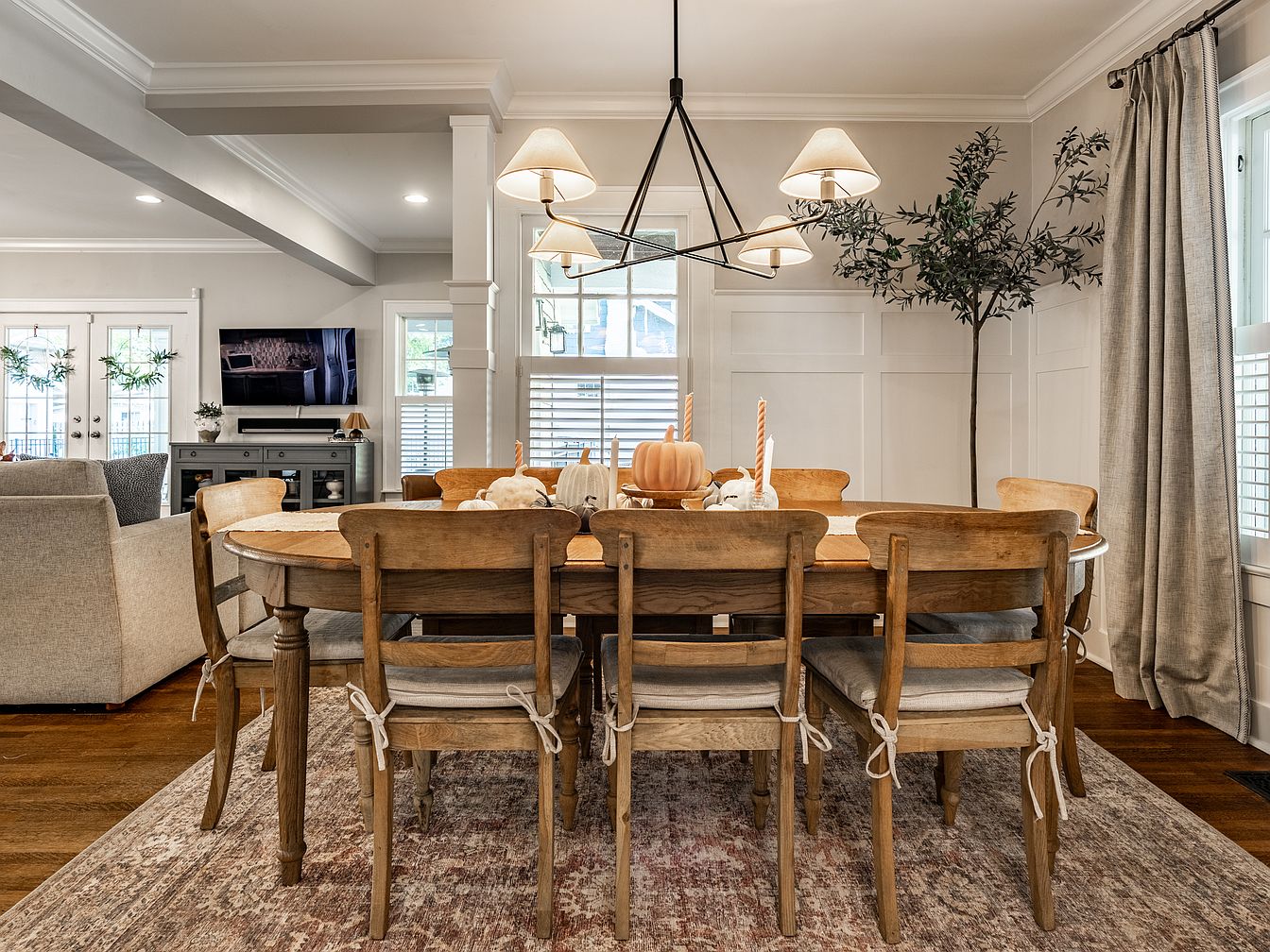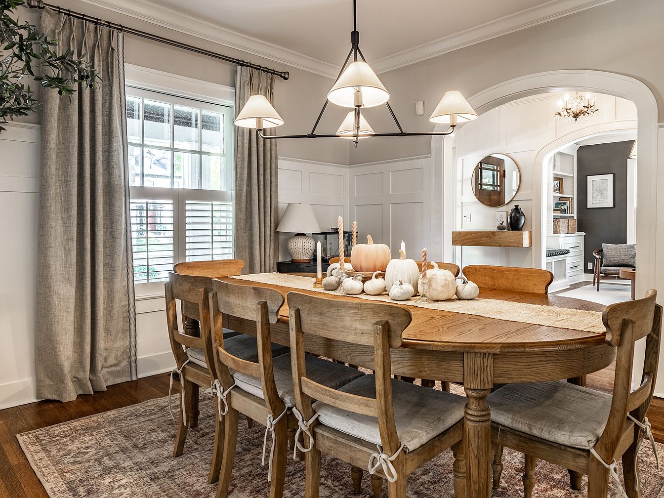 A spacious dining room features a large oval wooden table surrounded by six matching wooden chairs with cushioned seats tied on with fabric bows. The table is decorated with an arrangement of neutral-colored pumpkins and candles, adding a seasonal or festive touch. Soft gray curtains frame a window with white plantation shutters, letting in gentle natural light. Paneled wainscoting and a subtle beige wall color create a classic, elegant backdrop. Overhead, a contemporary chandelier with simple white shades adds brightness. An arched doorway leads to another room, where a round mirror, small console table, and comfortable chair are visible, contributing to a welcoming atmosphere.