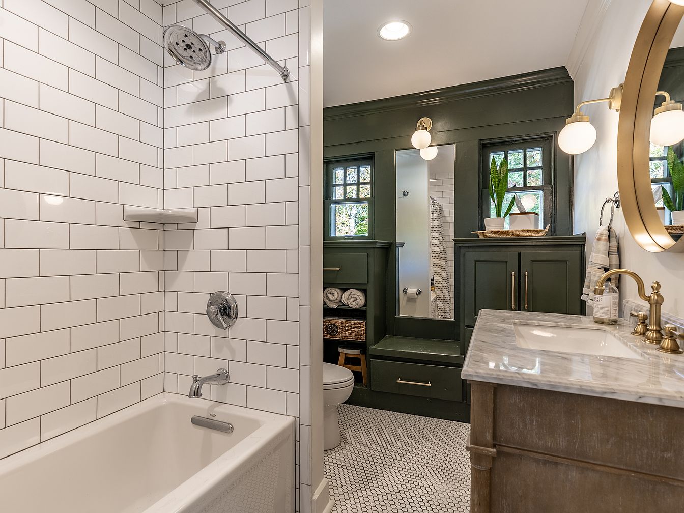 A classic bathroom with a blend of modern and historic elements. The bathtub and shower feature crisp white subway tiles with chrome fixtures, contrasted by the deep olive-green cabinetry. The cabinets are topped with a marble counter and brass faucet, illuminated by round, globe-style sconces beside a round brass-framed mirror. Hexagonal mosaic floor tiles add vintage elegance, while two narrow windows framed in green provide natural light. Decorative baskets and potted plants give the space a touch of coziness, and built-in cubbies store towels and essentials neatly. The overall color palette includes white, green, brass, and natural stone.