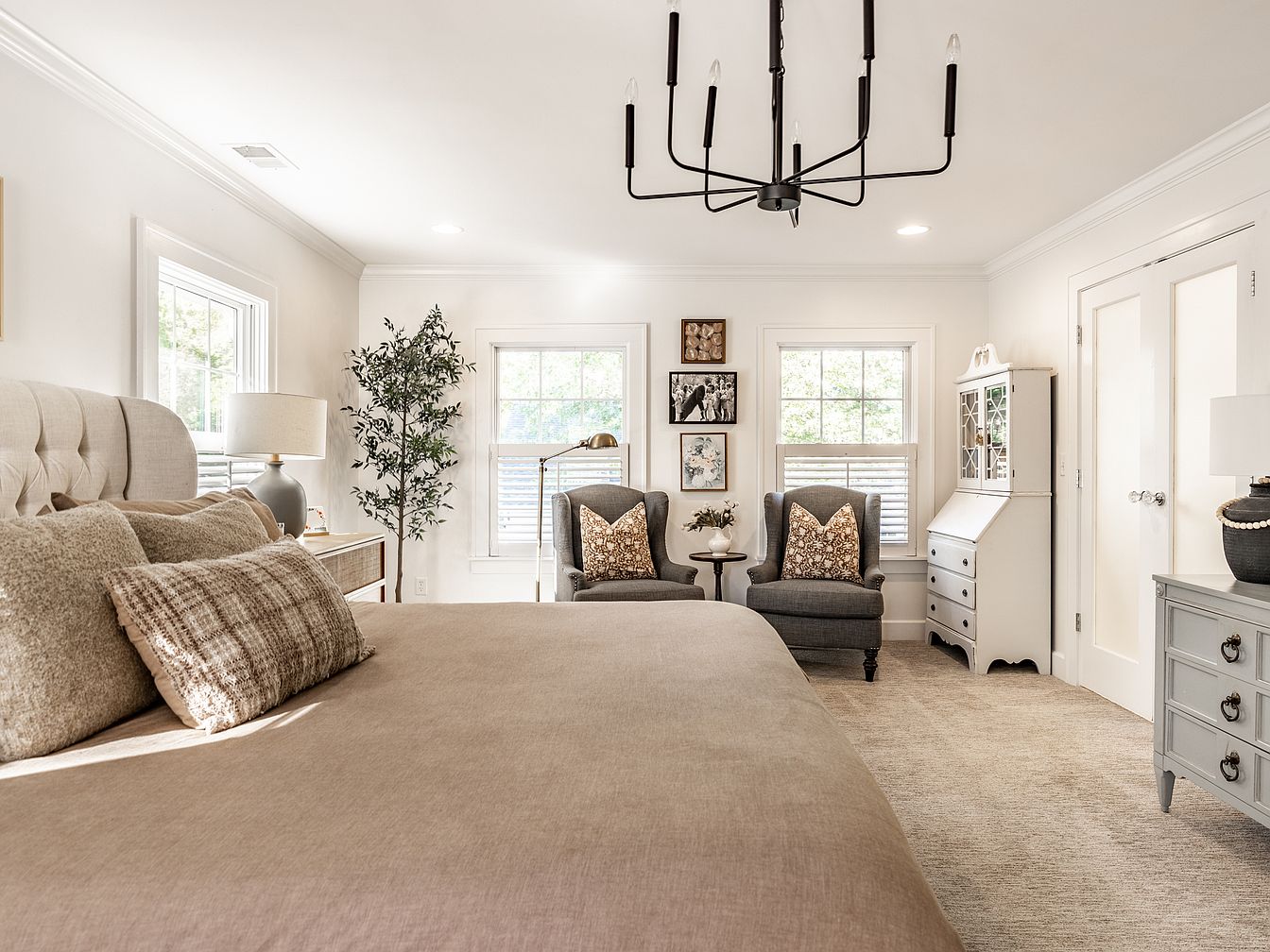 A spacious, sun-filled bedroom with a soft color palette of warm beige and crisp white. The plush bed anchors the left side, dressed in textured pillows and a neutral duvet. Two elegant, dark gray armchairs with patterned accent pillows sit by the windows, separated by a small black table with a vase. Floor-to-ceiling windows along the rear wall allow natural light to bathe the room. A leafy houseplant and a gallery wall of framed art add visual interest. The ceiling features crown molding and a dramatic black modern chandelier, while vintage-inspired dressers and a white secretary desk complete the welcoming look.