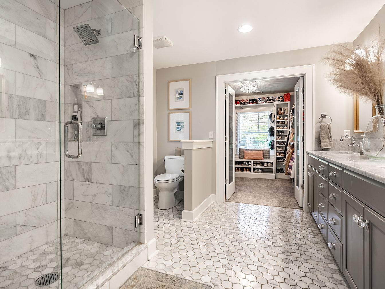 Elegant marble tiles cover the shower walls and floor area, lined with large rectangular slabs inside the shower and small hexagonal tiles outside. Glass shower doors, chrome fixtures, and a rainfall showerhead give a contemporary touch. To the right, a double vanity with gray cabinetry and marble countertop is accessorized with a large vase holding pampas grass, and wall-mounted lighting flanks generously sized mirrors. The color palette mixes soft grays, whites, and neutral taupe. Beyond the bathroom, double doors lead into a spacious walk-in closet, neatly organized with shelves full of shoes, accessories, and a bench under a sunlit window.