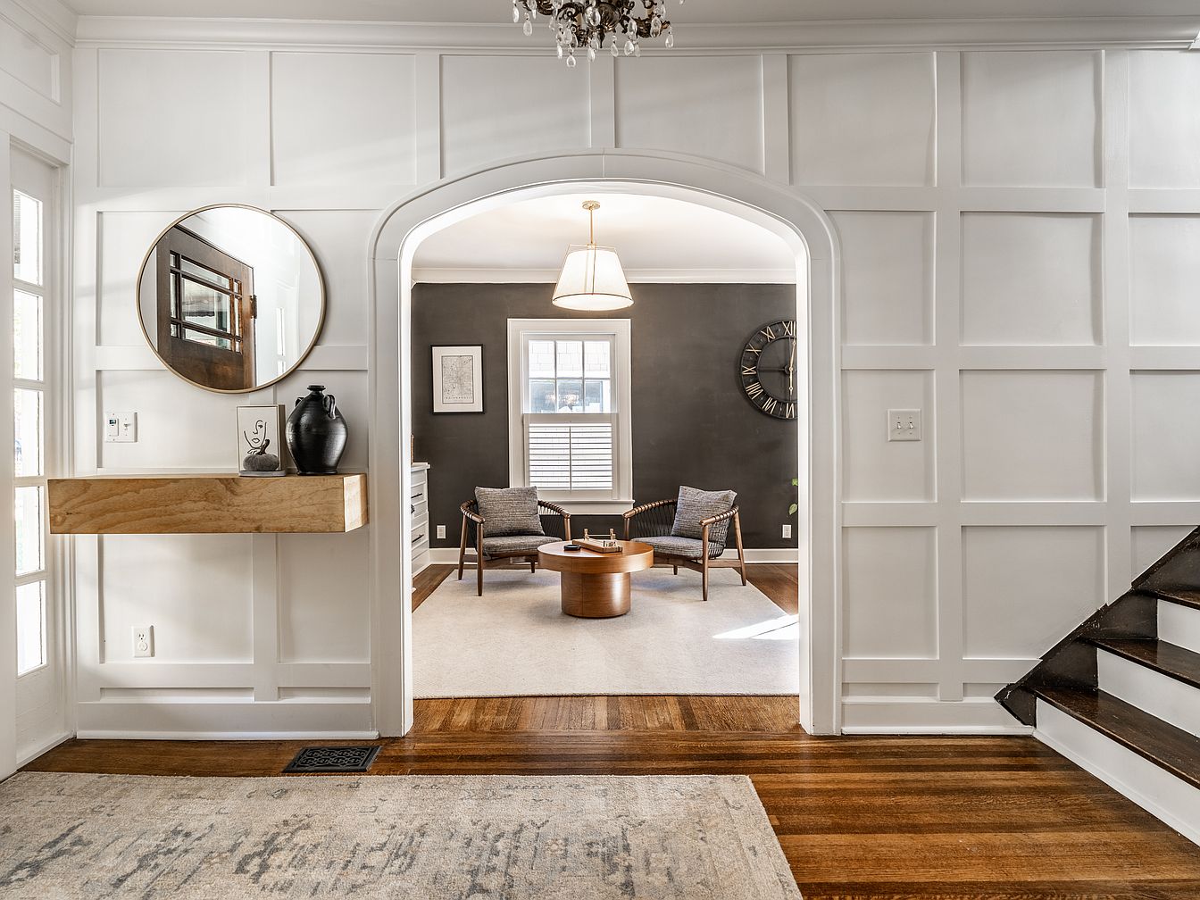 Wide, paneled white walls set the stage in this foyer, defined by geometric trim that lends a sense of classic architectural detail. A wood floating shelf supports decorative objects beneath a large round mirror, which reflects the space and enhances light. The floor is warm-toned hardwood, partially covered by a light area rug, leading up a dark-wood staircase to the right. Through a graceful, arched doorway lies a sitting area with a dark accent wall, mid-century style chairs, a round wooden coffee table, and a large clock, creating a blend of historic elegance and modern comfort.