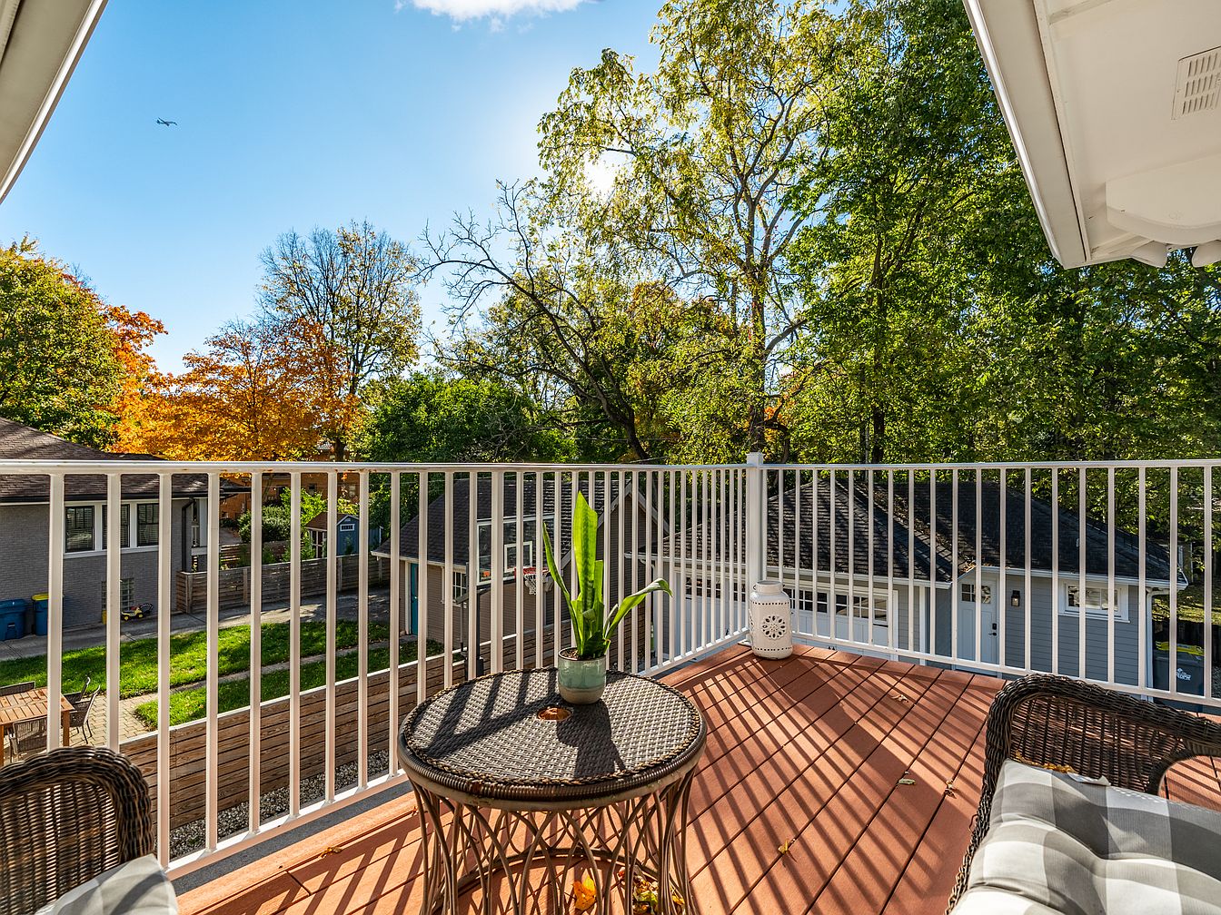 A cozy outdoor seating area on an elevated deck, featuring natural wood-toned flooring and surrounded by a crisp white metal railing. Two classic wicker chairs with plush gray and white checkered seat cushions flank a small round wicker table. A potted green plant sits atop the table, bringing a touch of nature to the space. Dappled sunlight filters through surrounding mature trees, casting striped shadows on the floor. The background reveals views of neighboring rooftops, garages, and lush greenery, with a vibrant mix of fall foliage accenting the serene and inviting atmosphere of this peaceful outdoor retreat.