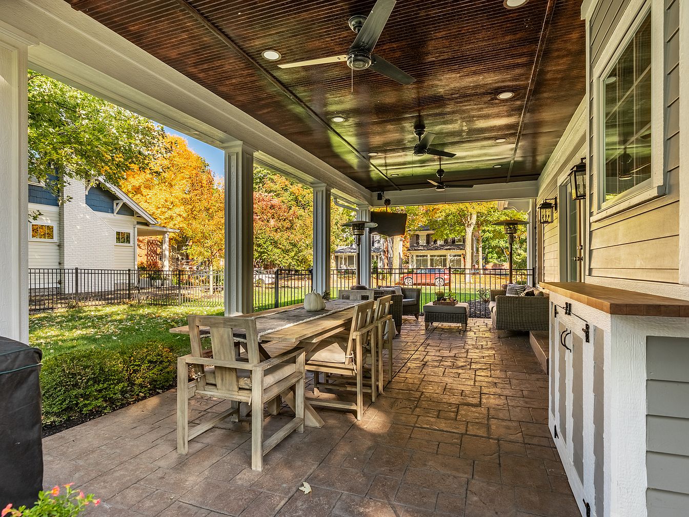 A spacious covered patio features rustic charm with a long, raw wood dining table and matching benches centered on durable stone-tiled flooring. The ceiling is dark stained wood with recessed lighting and two black ceiling fans, adding a touch of modern comfort. White posts frame the open-air view of a leafy, green and gold backyard, surrounded by ornamental black fencing. A side buffet or countertop stands near the house’s shiplap siding, complemented by lantern-style sconces. At the far end, outdoor lounges and a television suggest a versatile space for casual gatherings and relaxing. Warm autumn colors enhance the inviting, cozy atmosphere.