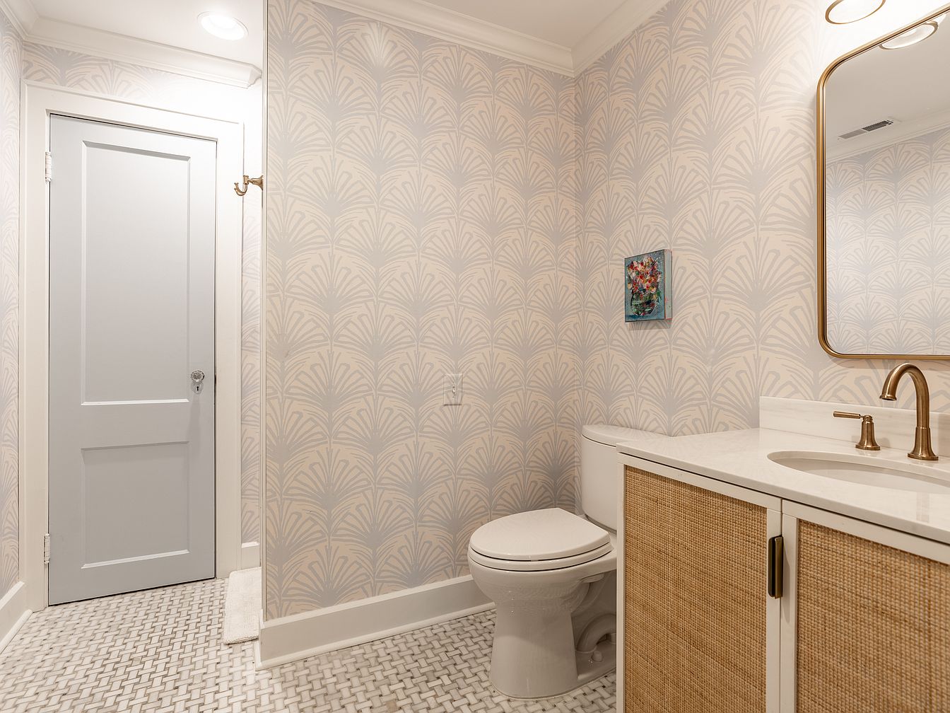 A small, stylish powder room featuring soft cream and gray geometric wallpaper with an art-deco-inspired fan motif that wraps around the walls. The vanity has a white countertop with a gold-tone faucet and fixtures, and the cabinetry displays woven rattan panels, adding a touch of natural texture. There is a rectangular mirror with rounded edges framed in gold hanging above the sink. The toilet is tucked into the corner next to a piece of colorful floral wall art. The white basket-weave tile floor complements the overall neutral and light ambiance, giving the space an airy, elegant feel.