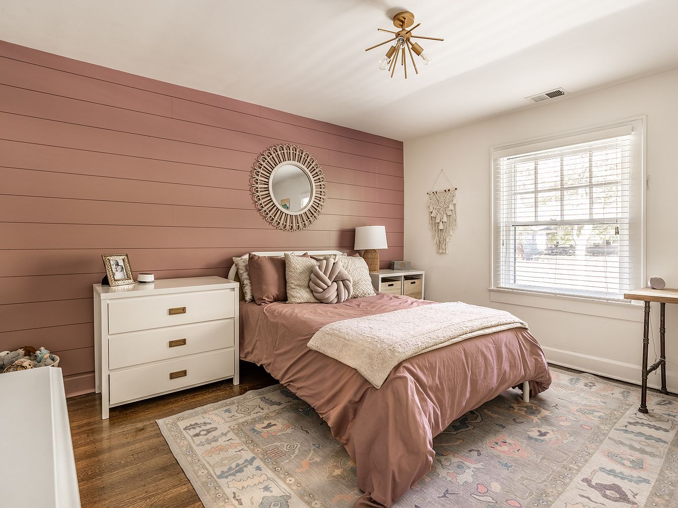 A cozy bedroom features a dusty rose shiplap accent wall behind the bed, which is dressed in matching rose-colored linens and an assortment of plush pillows. Above the bed hangs a round, decorative mirror with a sunburst frame, adding a focal point. On one side of the bed sits a modern white three-drawer dresser with gold hardware, displaying a photo frame and a small decor piece. To the right, natural light streams in from a large window with white blinds, brightening the softly patterned area rug. The neutral walls, light wood flooring, and unique gold chandelier complete the room’s airy, serene ambiance.