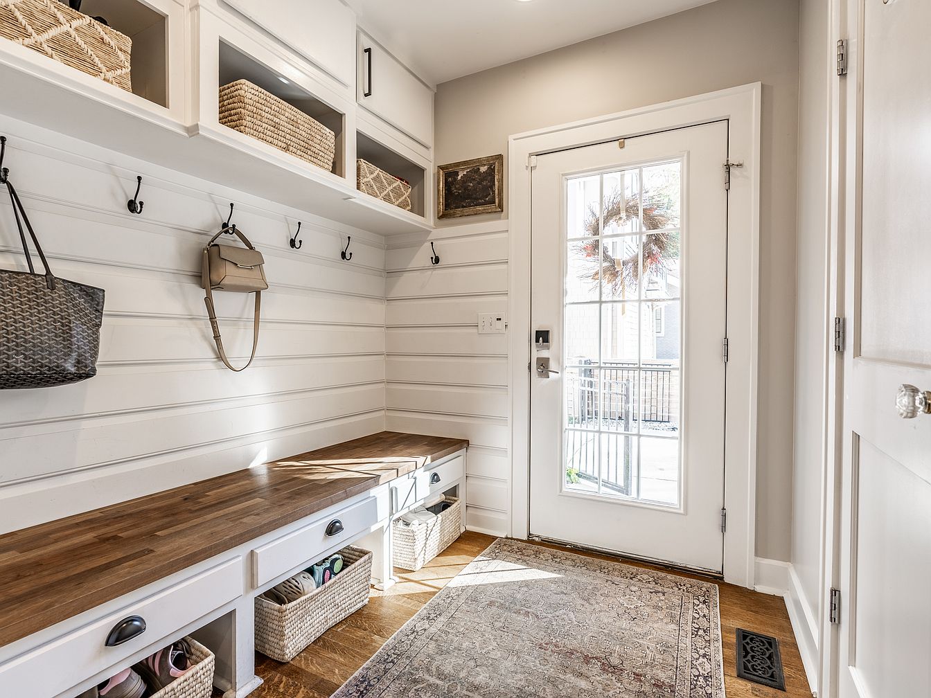 A bright and organized mudroom featuring a large glass-paneled door with white trim lets in natural light. Walls are covered in wide white shiplap, and the space is finished with blonde hardwood flooring. A built-in wooden bench with a natural wood surface runs along one side, providing seating and storage. Woven baskets sit underneath and above the bench in open cubbies and shelves, perfect for organizing shoes, bags, and accessories. Black hooks are mounted along the wall for hanging coats and purses. A patterned rug adds warmth and texture, while overhead recessed lighting keeps the area well-lit. The look is clean, functional, and welcoming.