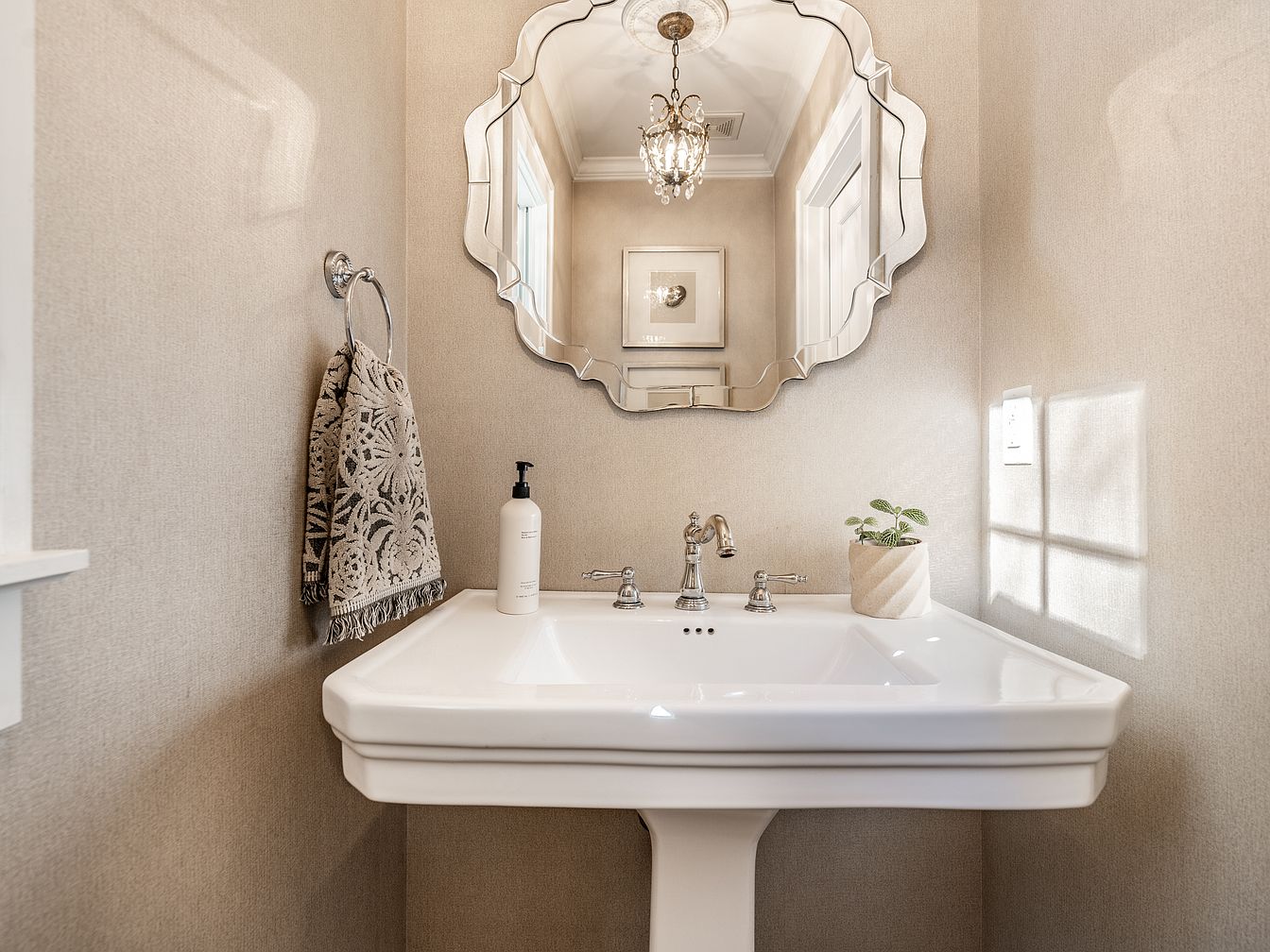 A small powder room with a pedestal sink features soft beige wallpaper and a classic white porcelain basin. Above the sink hangs a decorative mirror with a scalloped frame, reflecting a framed picture and a crystal chandelier that provides a touch of vintage elegance. A patterned hand towel hangs from a chrome ring on the left, and a bottle of soap sits on the right side of the sink alongside a small potted plant in a textured white pot. Natural light filters in, creating soft reflections on the walls, and enhancing the clean, serene atmosphere of this compact space.