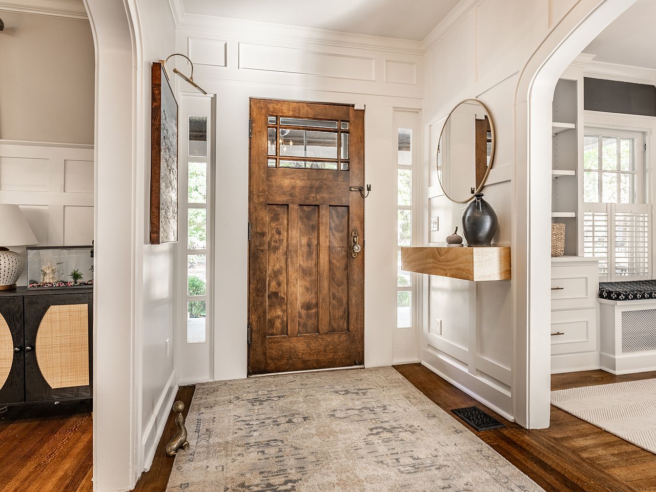 A welcoming entryway featuring a large, rustic wood front door with matching sidelight windows that allow natural light to filter in. The walls are painted a soft off-white, adorned with classic wainscoting and subtle panel molding. A neutral-toned area rug lies on the medium-tone wood flooring, enhancing the cozy ambiance. On one wall, a narrow floating wooden shelf holds a ceramic vase and decor, complemented by a large round mirror above it. Open archways and built-in shelving in nearby rooms contribute to a sense of openness and elegant continuity throughout the home.