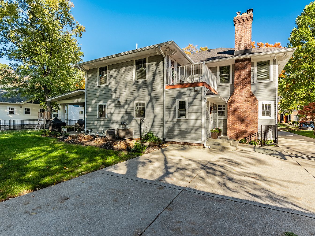 A wide concrete driveway leads to the rear entrance of a two-story historic American home. The exterior features light gray horizontal siding contrasted by white trim around multiple windows and a prominent red brick chimney. Steps ascend to a small covered porch with black metal railings and potted plants, creating a welcoming yet functional entryway. To the left, a spacious green lawn with mature trees provides ample natural shade, while garden beds line the home’s foundation. The bright, sunny sky highlights the clean lines and classic appeal of this well-maintained property.