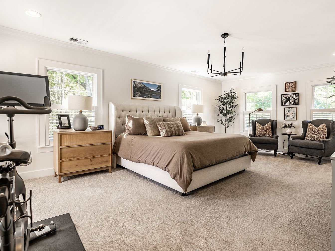 A spacious bedroom filled with natural light from several large windows, featuring a plush, tufted headboard on the king-sized bed dressed in neutral brown bedding with an assortment of textured pillows. Matching wooden nightstands with modern ceramic lamps flank the bed. To the right, two large, dark-hued armchairs with accent pillows and a small side table create a cozy seating nook near framed artwork and another window. A light, neutral carpet covers the floor, and a sleek, modern chandelier hangs overhead. A stationary exercise bike is positioned in one corner, blending comfort with functionality. Soft, understated colors give the space an inviting, serene atmosphere.
