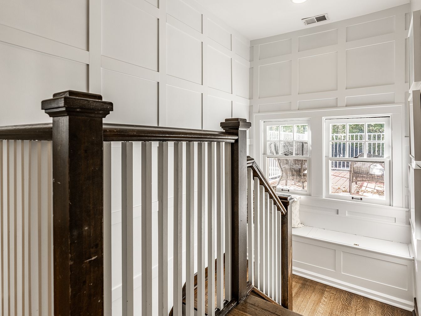 Bright and welcoming staircase landing featuring classic white paneled walls with a grid pattern, offering a sense of historical charm and elegance. The staircase has dark-stained wooden railings and newel posts, paired with white painted balusters for a crisp contrasting effect. A built-in window seat below double windows invites natural light into the space, enhancing its airy feel. The hardwood floors add warmth and continuity, while the overall palette remains neutral and cohesive. Outdoor patio furniture is visible through the windows, suggesting a connection to an exterior living area. The architectural detailing reflects a timeless, traditional aesthetic.
